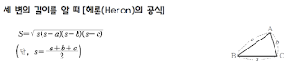 삼각형의 넓이는 밑변 곱하기 높이 나누기 2입니다. 누구나 다 아는 기본적인 공식이죠. 그런데 세 변의 길이만 주어져도 삼각형의 넓이를 구할 수가 있습니다. 바로 헤론의 공식 (Heron’s Formula)덕분입니다.