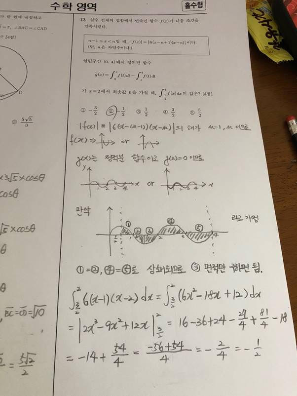 2023년 수능 수학 홀수형 공통 12번 문제 풀이입니다. 이 문제를 풀면서 얼마나 스트레스를 받았는지 당이 떨어져서 자유시간을 몇 개나 먹었나 모르겠습니다. 사진에도 자유시간 껍데기가 같이 찍혔네요. 제 기억으로는 이 문제를 푸는 데에만 3일 정도 걸렸던 것 같습니다. 퇴근하고 집에 가서 밤 늦게까지 이 문제에만 매달렸던 것 같습니다. 오픈북으로 푸는 제가 이렇게 스트레스를 받는데 수험생 여러분들은 정말 존경스럽습니다. 모두 이해하고 푸신 거 맞죠? 저는 다시 풀라고 하면 또 며칠 걸릴 것 같습니다. 제가 힘들어했던 부분은 굳이 왜 절대값 기호를 썼냐는 것입니다. 마치 f(x)가 항상 양의 값을 갖는다는 착각을 하게 만들어서 거기에 홀딱 넘어가버려 한참을 고생했습니다.