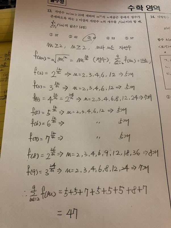 요즘 수학은 문제를 이해하는 것도 쉽지 않은 것 같습니다. 결국 13번 문제는 약수를 구하는 문제와 동일합니다. n을 2부터 9까지 대입해서 차례로 확인해보면 됩니다. 시그마로 불리는 수열의 합 문제는 보통 무한 급수와 연관되어 많이 나오는데 이 문제는 그런 거 필요 없고 유한 수열에 몇 개 되지 않으니 저처럼 무식하게 확인해보면 됩니다. 단, 이런 방식에서는 실수가 나오기 딱 좋기 때문에 꼼꼼한 성격이 보다 유리합니다. 문제를 꼼꼼하게 읽지 않으면 n이 1보다 크다고 착각할 수도 있어 개수가 다른 결과를 얻을 수도 있으니 주의해야 합니다.