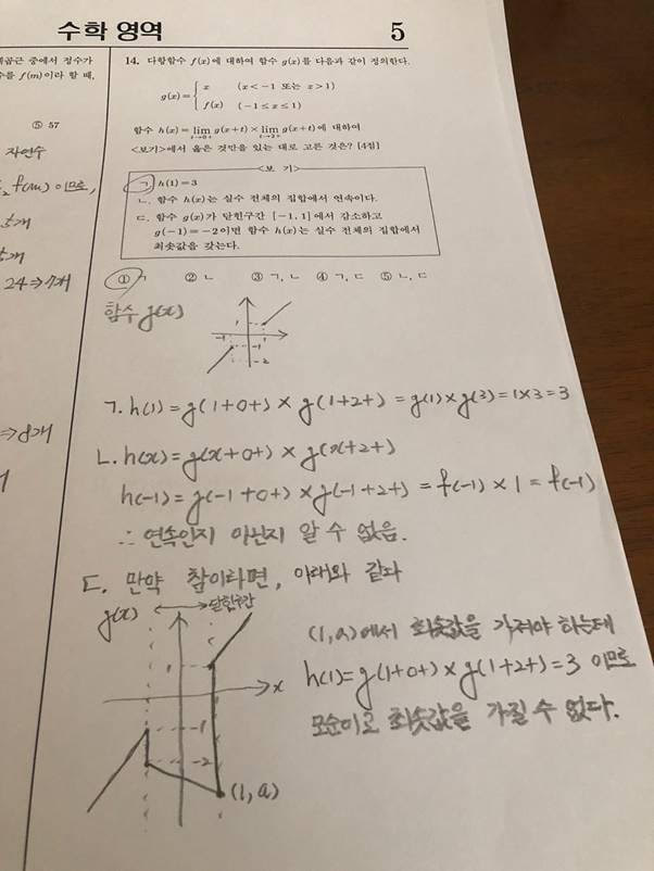 2023년 수능 수학 홀수형 공통 14번 문제는 다항함수의 수렴과 극한 문제입니다. 문제를 참 꼬아도 이렇게 꼬아 놓을 수 있나 싶었습니다. 학력고사 세대인 저에게는 정말 처음 보는 문제입니다. f(x), g(x), h(x)를 각각 정의하고 구간을 정해준 뒤 참인 것을 고르라고 합니다. 다항함수에 합성함수, 거기에 구간 변화까지 아주 작정을 하고 문제를 낸 것 같습니다. 저는 도저히 뭔 말인지 처음엔 감도 안 잡혀서 그래프로 그려가며 이해했습니다.