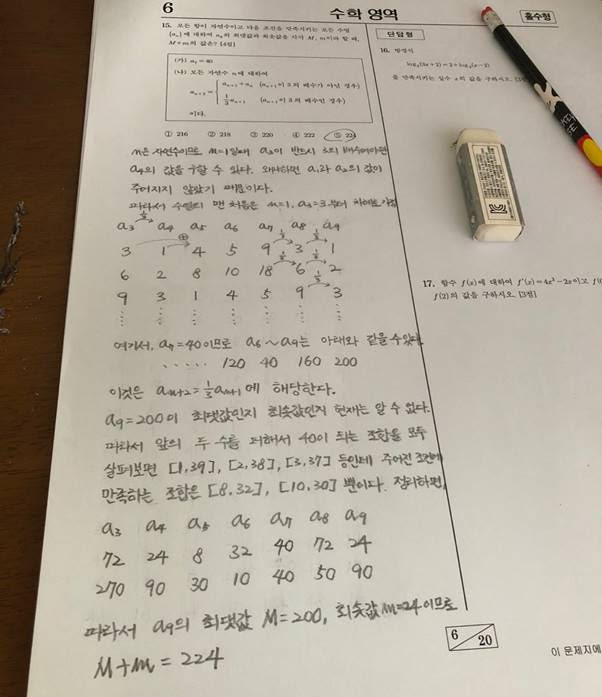 따라서 a9의 최솟값은 24, 최댓값은 200이므로 두 수의 합은 224입니다. 글로 설명하니 복잡하게 생각되시겠지만 천천히 곱씹어가며 잘 생각해보시면 원리는 의외로 쉬우니 실수만 조심하면 됩니다.
