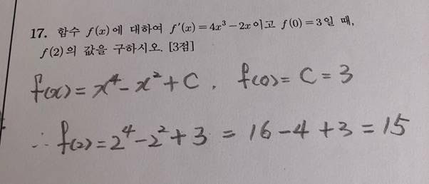 2023년 수능 수학 홀수형 공통 17번 문제입니다. 적분의 기본만 알면 풀 수 있는 문제입니다. 부정적분으로 상수 C가 필요한데, f(0)=3이라는 것을 문제에서 주어졌기 때문에 간단히 적분 상수 C를 구할 수 있습니다. 이제 f(x)를 알았으므로 x=2만 대입해서 풀면 되는 간단한 문제입니다. 이 문제는 그냥 3점 주려고 낸 문제인 것 같습니다. 하지만 방심은 금물입니다. 쉬운 문제일수록 검산을 해봐야 합니다. 실제로 저는 고등학교 때 2의 4승을 16이 아니라 64라고 계산해 놓고 검산도 안해서 틀린 적도 있었습니다. 너무 당연히 맞았다고 생각해서 자만한 결과였습니다. 수학은 이와 같이 실수를 최소한으로 하는 것이 잘하는 것입니다. 아무리 아는 것이 많아도 실수가 많으면 잘하는 것이 아닙니다.