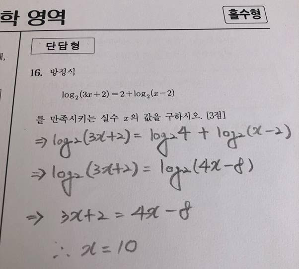 2023년 수능 수학 홀수형 공통 16번 문제입니다. 주관식 문제가 시작되었네요. 로그의 기본만 알면 간단히 풀 수 있는 문제입니다. 로그와 지수의 변환, 로그의 덧셈, 상수의 로그 변환 등의 기본 원리만 이해하면 됩니다. 로그 함수는 지수 함수의 역함수이고 로그 함수의 결과값이 지수가 됩니다. 따라서 상수 2는 로그 밑의 수가 2이므로 밑의 수가 2인 log4로 변환되고 밑의 수가 같은 로그의 덧셈은 곱셈으로 처리됩니다. 따라서 등식이 성립하려면 양변의 로그 위의 수끼리 같아야 하므로 방정식으로 계산하면 됩니다. 이런 문제만 나오면 좋겠습니다.