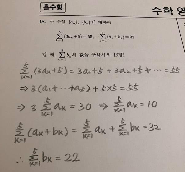 수열의 합에서 조심해야 할 것은 상수의 처리입니다. 여기서는 5인데 그냥 단순히 괄호 밖으로 나가서 계산했다가는 틀립니다. 그래서 저는 조심하기 위해서 일부러 수열을 풀어 쓰면서 정리한 것입니다. 저도 고등학교 때 이런 실수를 정말 많이 했었기 때문에 몸에 습관이 밴 것 같습니다. 역시 수학은 시행착오를 많이 겪어봐야 하고, 여기서 시행착오란 많이 틀리고 많이 좌절해봐야 한다는 의미입니다. 그래서 제가 맨날 얘기하는 것과 같이, 수학은 그래서 우리 인생을 닮았습니다. 많이 틀려보고, 많이 실패한 만큼 성장하게 되어 있습니다. 수학을 만점 받은 친구가 있다면 그 친구는 세상 누구보다 많이 틀려봤던 친구일 것입니다. 수많은 시행착오와 좌절감을 견뎌낸 결과로 좋은 성적을 받았을 것입니다. 가우스 형님이나 오일러 형님 같은 시대를 관통하는 수학 천재들이 아닌 이상 그게 정상입니다.