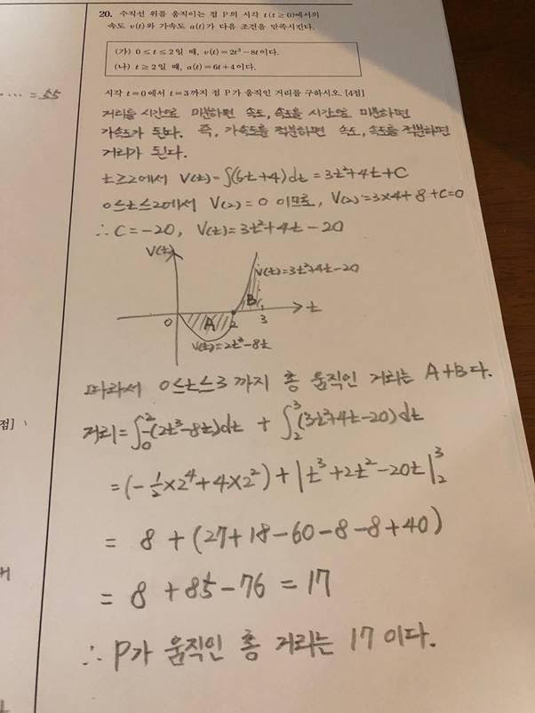 이제 모든 구간의 속도 함수를 알았고 기하학적으로도 그렸습니다. 그렇다면 점 P가 3초 동안 움직인 거리는 어떻게 구할까요? 거리를 시간으로 미분한 것이 속도이므로, 속도를 시간으로 적분하면 됩니다. 즉, 그래프의 면적이 바로 거리입니다. 여기에서 가장 조심해야 할 부분은 그래프의 아래쪽 부분의 면적입니다. 원래 그래프 아래 면적은 y 축이 음수 값이므로 당연히 음수로 나오게 됩니다. 그런데 거리라는 물리량은 마이너스가 될 수 없으므로 절대값으로 처리하거나 저처럼 앞에 마이너스 부호를 붙여줘야 합니다. 이 부분에서 실수를 많이 하셨을 것 같습니다. 그래프의 x 축의 윗부분과 아랫부분을 더해야 하니 단순히 덧셈만 하면 -8 + 9 = 1로 계산되므로 그냥 넘어가게 됩니다. 하지만 앞부분의 -8도 0~2초 사이에 움직인 거리이므로 말이 안 됩니다. 당연히 절대값인 8이 되어야 합니다. 문제의 출제자는 이런 빈틈을 노린 것으로 보입니다. 거리, 시간, 속도, 가속도 사이의 관계뿐만 아니라 거리와 시간의 기본 개념도 함께 이해하고 있는지를 묻고 있습니다. 기계적으로 외우지 마시고 이해하는 데에 집중하셔야 합니다. 처음에는 이해가 힘들어도 보고, 또 보고, 다시 또 보면 어느새 이해가 될 것입니다.