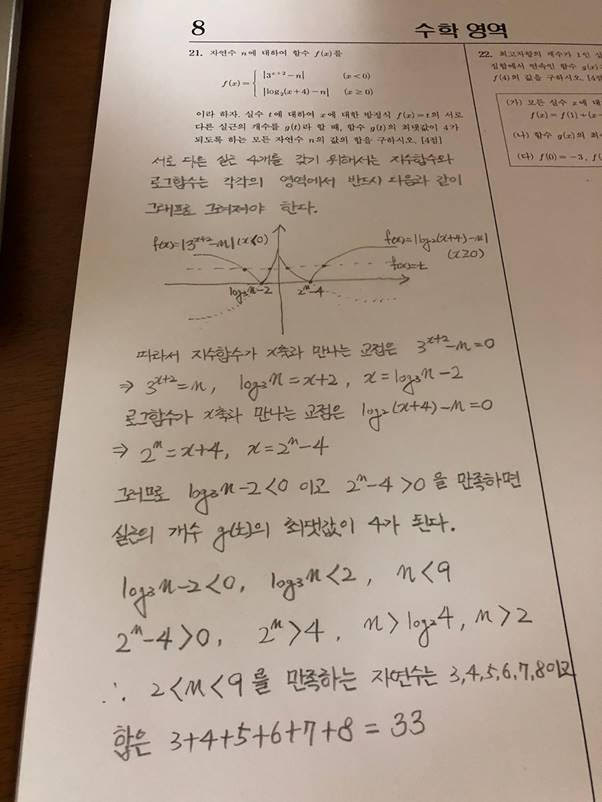 따라서 이제 두 함수의 x축과의 교점을 찾아서 그 교점이 지수함수는 0보다 작고, 로그함수는 0보다 크다는 조건식을 세워 n값을 구하기만 하면 됩니다. 이제부터는 쉽습니다. 곧바로 n의 범위가 2 < n < 9라는 것을 알 수 있습니다. 그리고 항상 말씀 드리지만, 자나깨나 실수 조심, 끝난 문제도 다시 보자! 문제에서 마지막에 뭘 구하라고 했죠? 자연수 n이 가질 수 있는 값들을 모두 더하라고 했습니다. 즉, 3~8까지 더하기만 하면 됩니다. 실수하도록 깨알같이 함정을 만들어 놨습니다. 정답은 모두 더해서 33입니다.