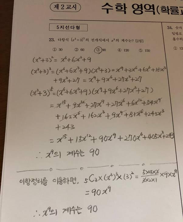 2023년 수능 수학 홀수형 확률과 통계 23번 문제 풀이입니다. 이 문제를 보자마자 곧바로 풀이를 시작했습니다. 5제곱이므로 그냥 하면 되겠거니 하고 아무 생각없이 풀기 시작했습니다. 중간쯤 풀었을 때 뭔가 느낌이 이상했습니다. 이 문제가 확률과 통계에 왜 나왔지? 분명히 뭔가 이상했습니다. 하지만 이미 중간쯤 풀었으니 일단 마무리하기로 했고, 나중에 더 편한 방법이 있다면 검증용으로 사용하자고 마음 먹었습니다. 아마 문제를 출제하신 분들도 공식 모르면 직접 풀어서라도 답을 찾아보라는 취지로 5제곱만 문제로 낸 것 같습니다. 만약 공식만이 목적이었다면 10제곱 이상을 냈을 것 같습니다. 그렇게 일단 다 풀고 나서 인터넷으로 검색을 해보니 순열과 조합에서 조합 (Combination)을 이용해서 푸는 방법이 있었습니다. 이때의 조합은 이항계수와 동일합니다. 어떤 순서로 뽑았는지 상관없기 때문입니다.