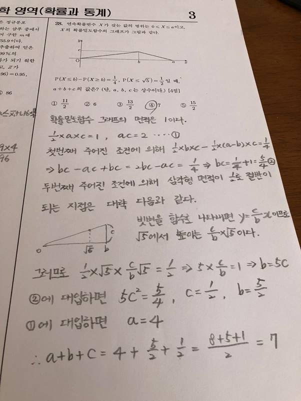 문제의 의미는 단순합니다. 첫번째 조건에서 확률이 b보다 작은 구간에서 b보다 큰 구간을 뺐더니 1/4이라는 의미는 삼각형이 이등변삼각형이 아니고 b가 중간에서 오른쪽으로 치우쳐져야 왼쪽 삼각형 면적이 더 커지므로 가능한 조건입니다. 그리고 두번째 조건은 루트 5보다 작은 구간의 면적이 1/2이므로 루트 5는 첫번째 조건에 의해 반드시 b의 왼쪽에 위치해야 합니다. 삼각형 면적의 절반이 되기 위해서는 당연한 조건입니다. 여기까지가 문제 풀이의 끝입니다. 이 다음부터는 연립방정식을 풀기만 하면 되는 간단한 문제로 바뀝니다. 연립방정식 정도는 다 풀 수 있다고 믿습니다.