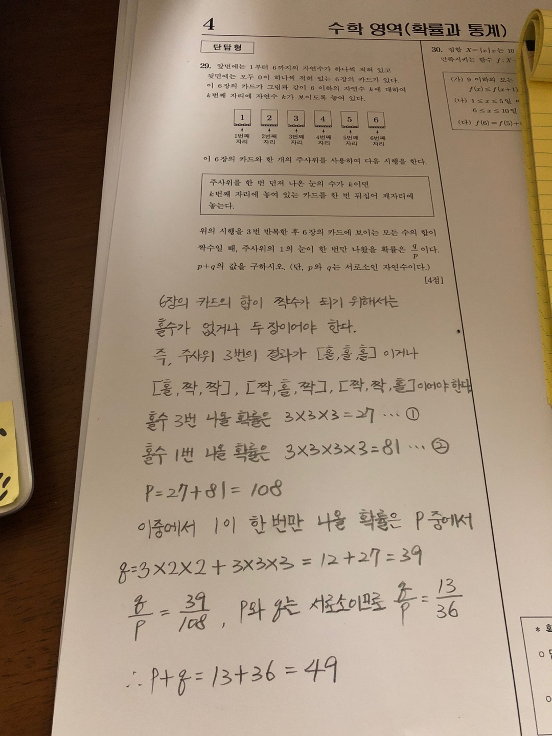 이 중에서 1이 한 번만 나올 확률을 구하기만 하면 됩니다. 1이 딱 한 번만 나오려면 위에서 첫번째 경우의 수로 [홀, 홀, 홀]에서 1이 한 번만 나오기만 하면 됩니다. 따라서 1이 한 번 나와 버리면 나머지 3개 중 2개만 남기 때문에 경우의 수는 3 X 2 X 2=12가 됩니다. 물론 2 X 3 X 2=12가 될 수도 있고, 2 X 2 X 3=12가 될 수도 있습니다. 어쨌든 1은 한 번만 나와야 하므로 순서에 상관없이 12가 됩니다. 두 번째 경우의 수는 홀수가 한 번만 나와야 하는데 그게 1이기만 하면 됩니다. 따라서 역시 순서에 상관없이 3 X 3 X 3=27이 됩니다. 홀수 3개 중에 1이 한 번 나오고 짝수가 두 번 연속 나와야 하므로 3을 두 번 곱해주면 됩니다. 즉, q=12+27=39 q/p=39/108인데 13으로 약분이 되므로 서로소를 만들어 주면 q/p=13/36입니다. 정답은 p+q=13+36=49입니다.