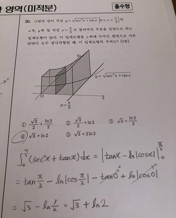 문제를 말로 풀어 보면, 2차원 좌표 상의 함수가 있고 함수의 y값을 한 변으로 하는 정사각형을 3차원으로 그려서 3차원 도형으로 만들면 부피는 얼마냐고 묻는 문제입니다. 부피가 됐든 면적이 됐든 단순히 정적분으로만 풀면 됩니다. 그래프의 면적을 구할 때 아주 작은 단위로 잘라서 더하는 것을 적분으로 정의하므로 여기에 한 번 더 곱해서 정사각형의 면적을 구해주기만 하면 됩니다. 그래서 함수가 루트로 씌워진 것입니다. 그러니 삼각함수인 시컨드와 탄젠트를 적분할 줄 아느냐고 묻는 것과 같습니다. 역시 저는 기억이 안 나서 인터넷으로 기본 적분 공식을 찾아보고 풀었습니다. 삼각함수의 미분과 적분 공식은 기본적으로 외워두는 것이 좋습니다. 문제를 많이 풀다 보면 저절로 외워지기도 합니다. 여기까지만 풀어 내면 그 다음부터는 단순 적분 문제로 바뀝니다. 굳이 설명하지 않아도 아실 거라고 믿습니다.
