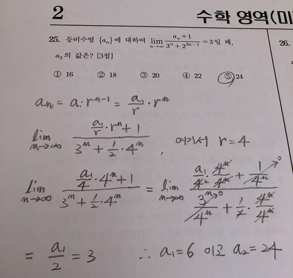 2023년 수능 수학 홀수형 미적분 25번 문제 풀이입니다. 이 문제는 극한 문제여서 미적분 문제로 분류된 것 같습니다. 사실 간단한 등비수열 문제입니다. 등비수열의 기본은 an = a1 X r^(n-1)입니다. 이것만 알아도 풀 수 있는 문제입니다. 극한 문제는 문제를 단순화시키는 능력이 중요합니다. 이 문제는 분자와 분모 모두 무한대로 발산하는 등비수열입니다.