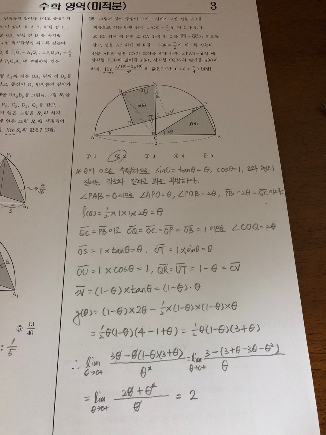 여기까지만 풀면 나머지는 쉽습니다. 최종 문제에 f(θ)와 g(θ)를 대입해서 풀면 정답은 2임을 알 수 있습니다. 이런 문제를 풀 때마다 각도가 한없이 작아질 때, 사인과 탄젠트는 θ에 수렴하고 코사인은 1에 수렴하며, 현과 호의 길이가 같아진다는 것을 이해하고 풀어야 합니다. 그게 이해가 안 되면 절대로 풀지 못합니다. 이와 같이 기하학 문제인데 각도가 0으로 수렴하면 일단 그렇게 생각하고 접근하면 됩니다. 저도 간만에 풀다 보니 책을 보면서도 한참이나 헤맸습니다. 이제 고3이 되실 분들은 꼭 참고하시기 바랍니다.