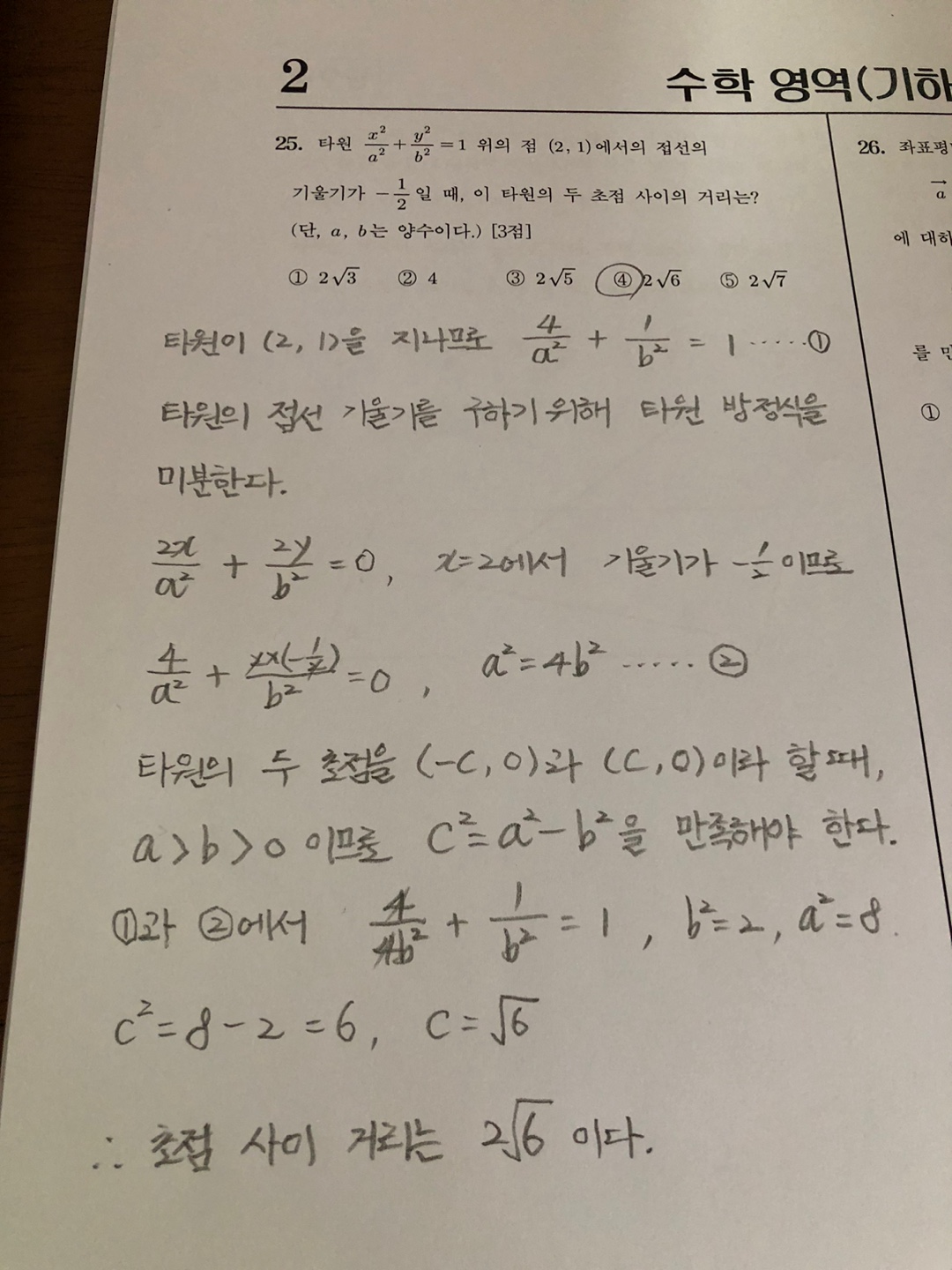 만약 주관식이었다면 루트 6만 쓰고 다 풀었다고 실수할 수 있으니 주의해야 합니다. 문제가 원하는 정답은 두 초점 사이의 거리이지 c값을 구하는 것이 아니기 때문입니다. 아무리 단순한 문제라도 풀고나서 검산도 해보고 원하는 정답이 이게 맞는지 꼼꼼하게 문제를 다시 읽어보는 습관을 들여야 합니다. 자주 말씀 드리지만, 아프더라도 시행착오를 몇 번 겪어야 몸에 습관이 생깁니다. 그래서 출제자들도 마지막에 항상 그런 식으로 끝맺음하는 경우가 많습니다. 다 구한 뒤, '서로소이다', '두 값의 합을 구하라', '반올림하라' 등과 같이 말입니다. 세상 모든 일이 다 그렇지만 틀리고, 실패하고 좌절하는 횟수만큼 성장합니다. 극복하고 묵묵히 견디는 법을 배워야 합니다. 수학 좋아하는 꼰대가 한 말씀 드렸습니다. :)