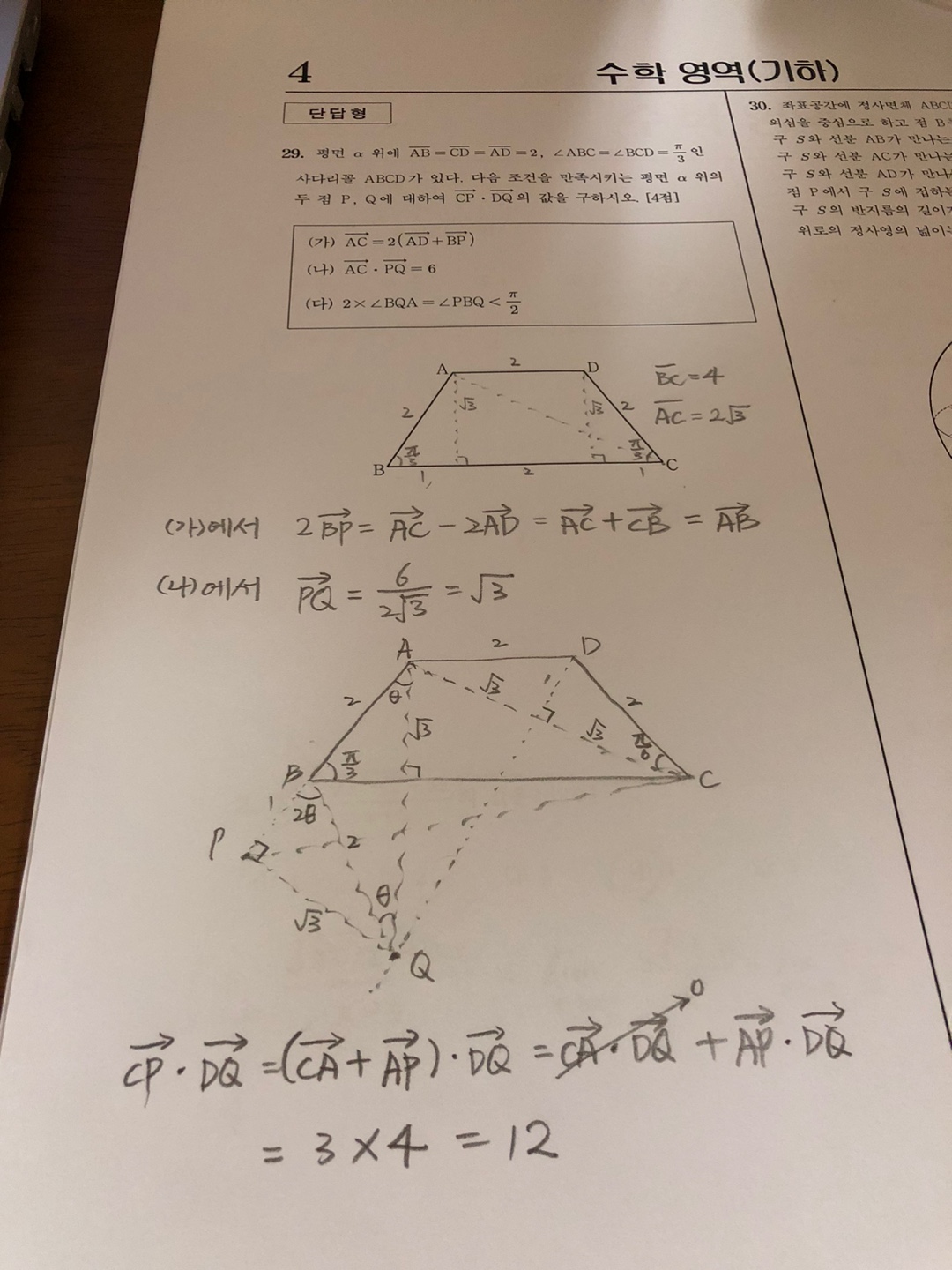 최종 문제는 CP·DQ 벡터의 곱을 구하는 것입니다. 벡터 DQ는 삼각형 DAQ에서 DA=2, AQ= 2√3이므로 피타고라스 정리에 의해 벡터 DQ=4라는 것을 쉽게 알 수 있지만, 벡터 CP는 주어진 조건만으로는 알기 어렵습니다. 그래서 출제 위원들이 벡터 문제로 낸 것입니다. 벡터 DQ도 먼저 풀지 말고 기다렸다가 풀면 됩니다. 벡터 CP=CA+AP로 바꿀 수 있으므로 벡터의 곱은 이렇게 정리할 수 있습니다. CP·DQ = (CA+AP)·DQ = CA·DQ + AP·DQ에서 CA·DQ는 두 벡터가 수직이기 때문에 0이 됩니다. 삼각형 ADC가 이등변 삼각형이고, 벡터 AC와 벡터 PQ가 평행하며, 벡터 AC=2PQ이기 때문에 수직일 수밖에 없습니다. 따라서 CP·DQ = AP·DQ = 3X4=12가 정답입니다.