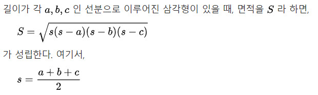 우리는 일단 삼각형 PQR의 면적부터 알아내야 합니다. ∠ABO=θ라고 하면, ∠APO'=θ입니다. 계산해보면 cosθ=1/√3입니다. AO는 피타고라스의 정리에 의해 6√2입니다. AB위에 O에서 내린 수직선과 만나는 점을 F라고 할 때, BF의 길이를 구할 수 있습니다. 계산해 보면 BF=2√3입니다. 이등변삼각형인 OBP에서 BF가 2√3이면 FP도 2√3입니다. 그런데 정사면체의 한 변인 AB의 길이가 6√3이므로 AP도 2√3입니다. 그렇다면 정사면체 APQR의 한 변의 길이는 각각 2√3입니다. 한변의 길이가 2√3인 정삼각형 PQR의 면적은 헤론의 공식으로 풀 수 있습니다. 헤론의 공식은 아래와 같이 간단합니다. 삼각형의 길이만 알고 각도를 모를 때 면적을 구할 수 있는 매우 유용한 공식입니다.