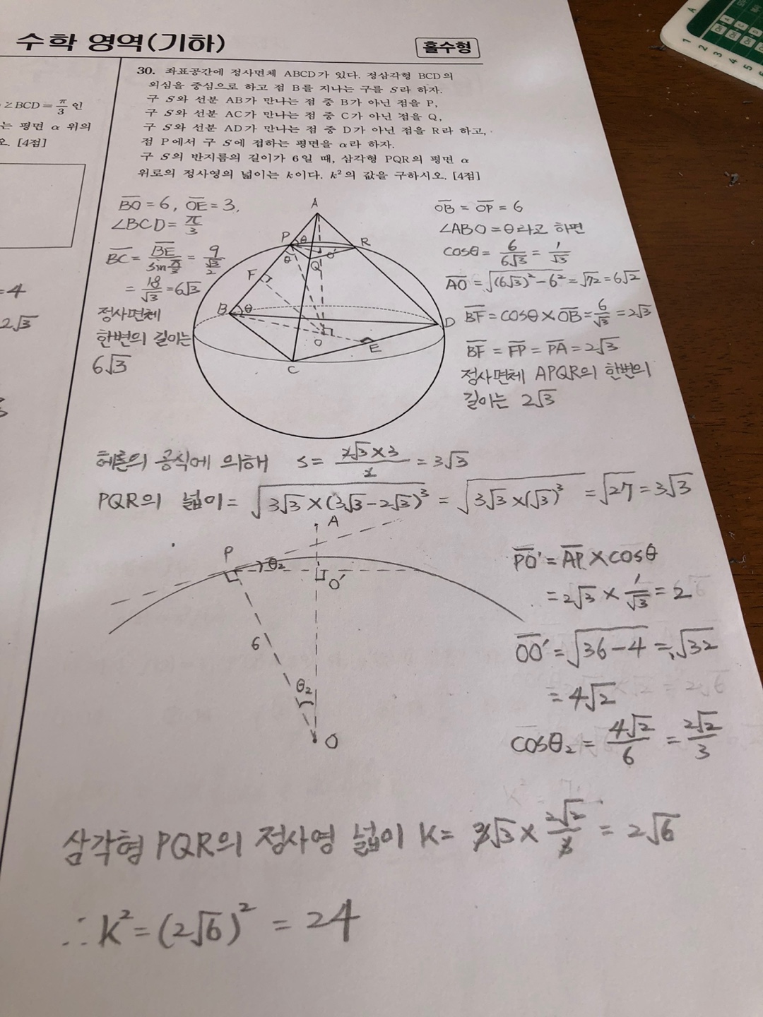 이렇게 풀면 삼각형 PQR의 면적은 3√3입니다. 이제 제가 손글씨로 푼 것처럼 좀 더 확대해서 보겠습니다. 점 P에 접하는 평면 α와 삼각형 PQR 사이의 각도를 θ2라고 하면, 각도 POA도 역시 θ2입니다. PO'의 길이는 삼각형 APO'으로 구할 수 있습니다. AP의 길이가 2√3이고 각도 APO'이 θ이고 cosθ=1/√3인 것을 이미 위에서 풀어놨으므로 PO'=2입니다. 그렇다면 OO'은 피타고라스의 정리에 의해 길이가 4√2이므로 cosθ2=2√2/3 을 계산할 수 있습니다. 이제 삼각형 PQR의 정사영 면적 k를 구할 준비가 끝났습니다. 정사영 면적 k=PQR 면적 X cosθ2 = 3√3 X 2√2/3 = 2√6입니다. 이제 다들 눈치 채셨죠? 여기서 끝내면 망하는 겁니다. 그래서 다 풀었다고 방심하지 말고 문제도 다시 읽어보고 풀이과정도 다시 천천히 곱씹어 봐야 합니다. 최종 문제는 정사영 면적 k가 아니라 k^2입니다. 그래서 정답은 24가 되어야 합니다.