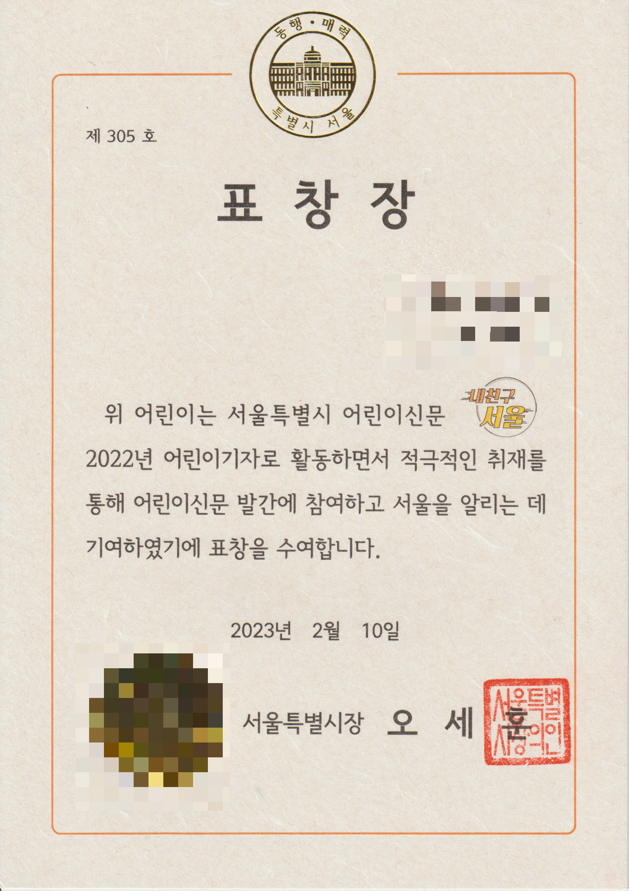 그렇게 2년간 활동을 마무리하고 그렇게 끝나는구나 했는데, 아이가 겨울방학이 거의 끝나갈 무렵 반가운 소식을 들었습니다. 서울시 어린이 기자들 중 우수 기자들 12명을 선정해서 서울시장 표창장을 수여하는데 딸아이가 받게 되었다는 것입니다. 정말 눈물 나도록 기뻤습니다. 좋은 상을 받아서라기보다 딸아이가 2년간 얼마나 고생을 했는지 잘 알고 있기 때문에 그에 대한 보상을 받게 되어 너무나 다행이라는 생각 뿐이었습니다. 평생 잊지 못할 우리 가족만의 추억을 갖게 된 것도 기뻤고, 딸아이의 경력에 큰 방점을 찍게 되었으므로 앞으로 무엇을 하든 도움이 될 것이므로 더 행복했습니다. 무엇보다 저는 본인이 원하는 일을 오랫동안 묵묵히 한 것에 대해 보상을 받는 즐거움과 성취감을 맛볼 수 있었다는 점이 가장 좋았습니다. 이와 같이 작든 크든 오랜 시간 동안 공을 들여 노력한 일이 성공한 경험은 인생에서 가장 중요하다고 생각합니다.