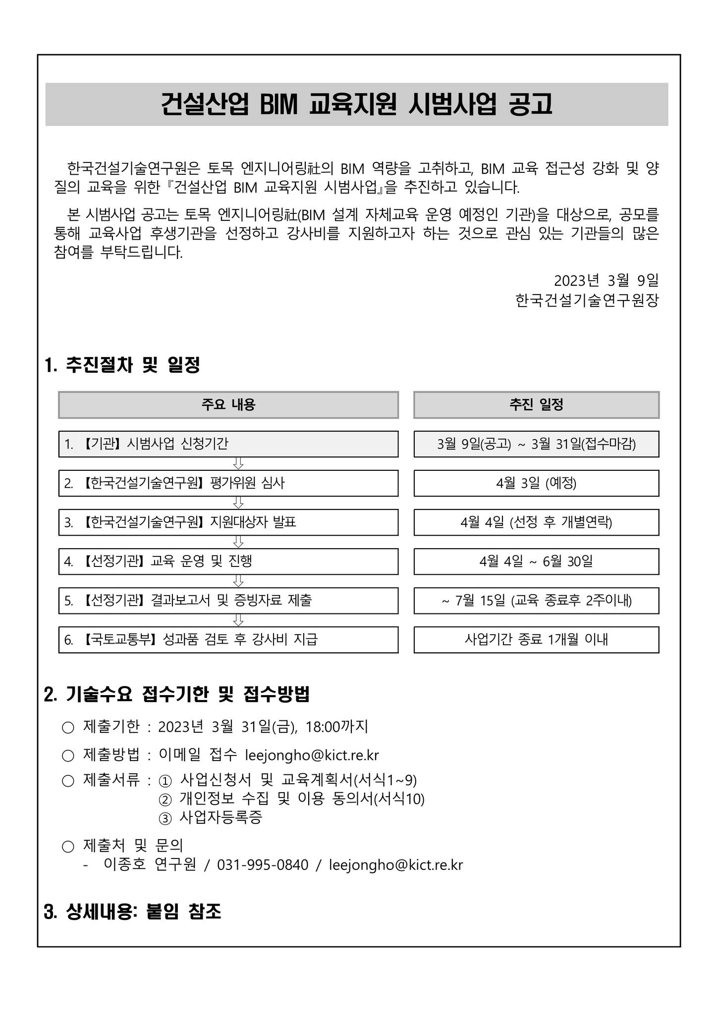 제목 : 한국건설기술연구원, 건설산업 BIM 교육지원 시범사업 공고