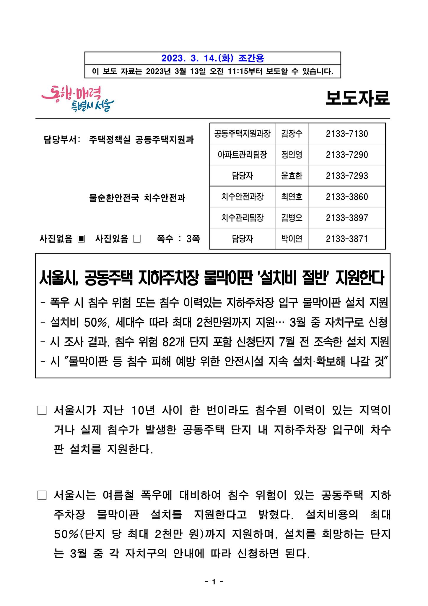 제목 : 서울시, 공동주택 지하주차장 물막이판 설치비 지원