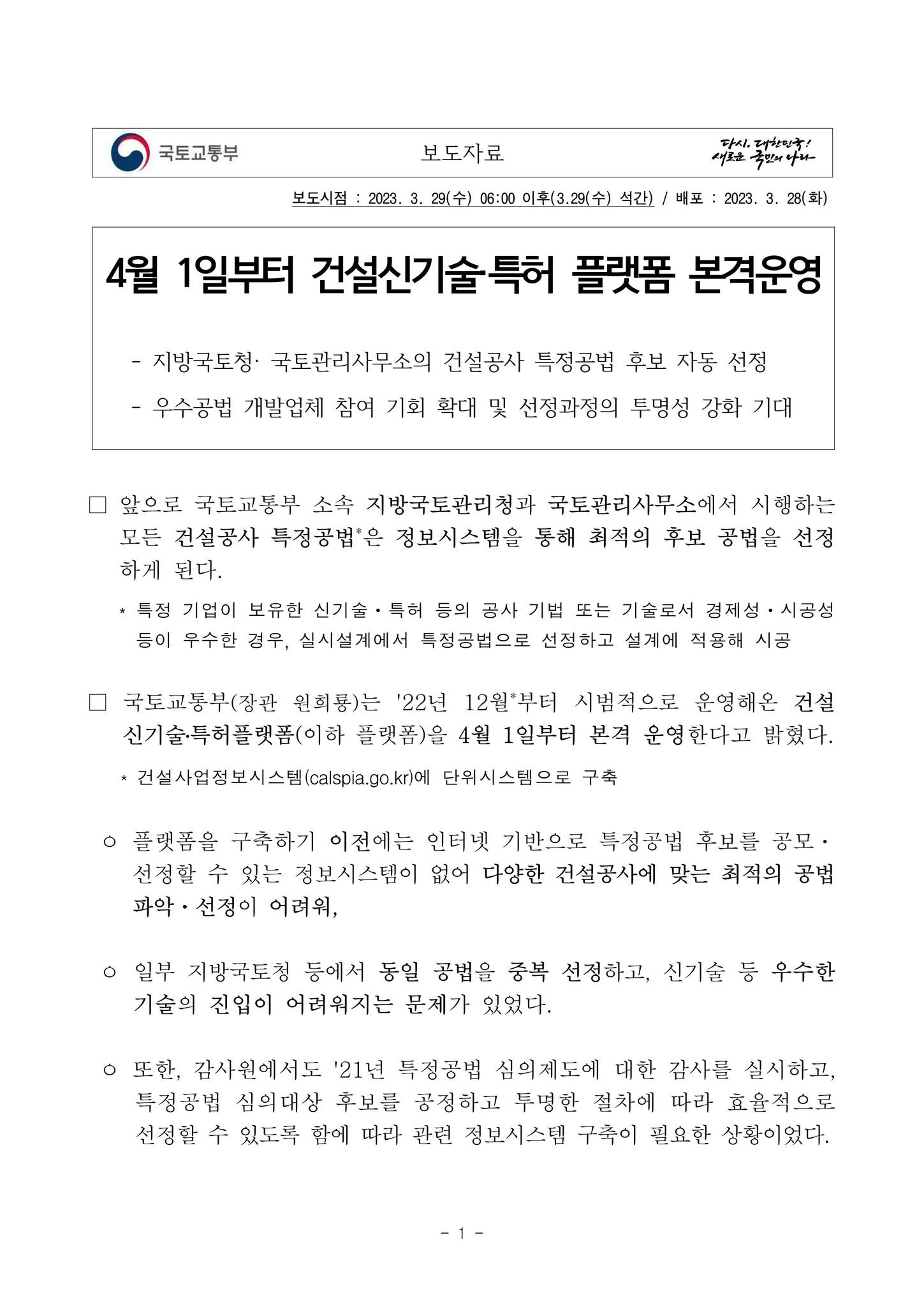 자료 다운로드 : 230328(석간)1일부터_건설신기술_특허_플랫폼_본격운영(기술정책과)