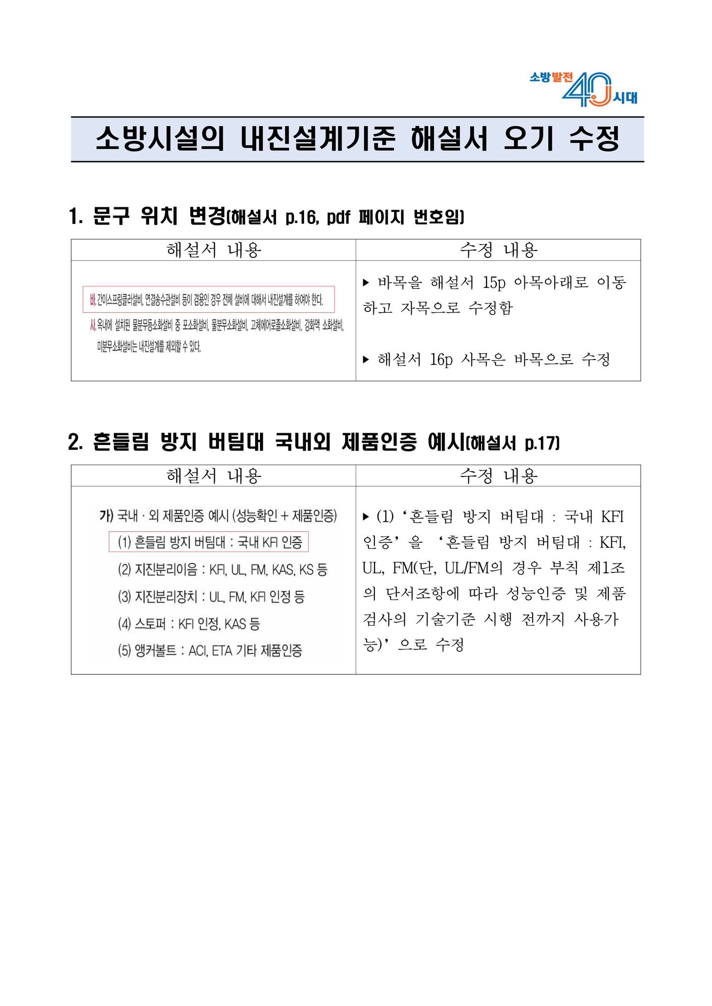 안내 : 소방시설의 내진설계 기준 해설서를 수정할 필요가 있어 게재를 중단하였으나, 그럼에도 불구하고 이를 필요로 하는 질의들이 있어 해설서 수정 전까지 기존 해설서를 다시 게시하오니 업무참고용으로만 활용하시고, 이를 근거로 국민들에게 고시에서 정하지 않은 새로운 의무를 부담하게 하는 등 해설서의 본래 취지를 벗어나는 근거로 활용하지 않도록 주의해 주시기 바랍니다.