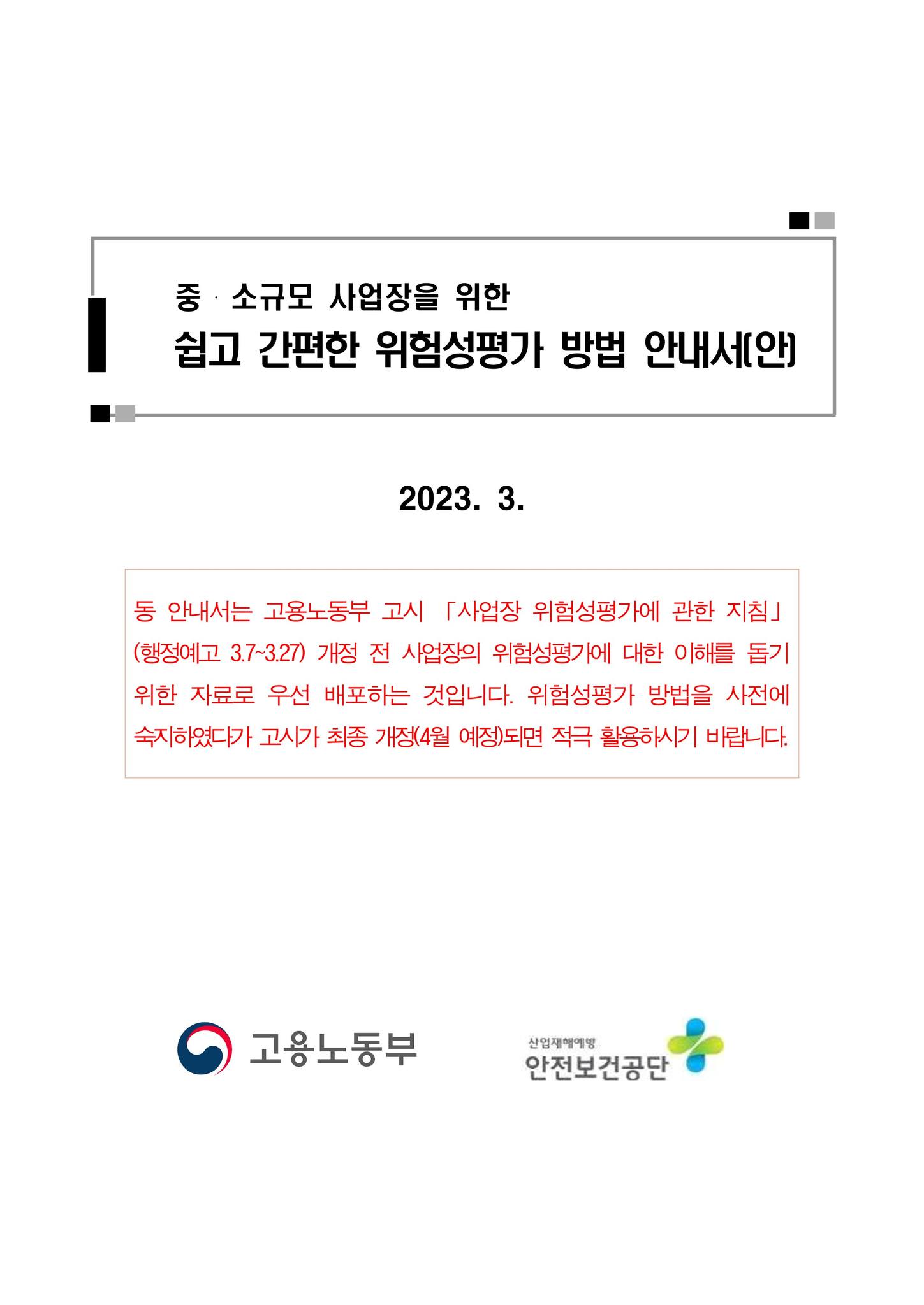 고용노동부 고시 「사업장 위험성평가에 관한 지침」 개정 전 사업장의 위험성평가에 대한 이해를 돕기 위한 자료로 우선 배포하는 것으로 위험성평가 방법을 사전에 숙지하였다가 고시가 최종 개정(4월 예정)되면