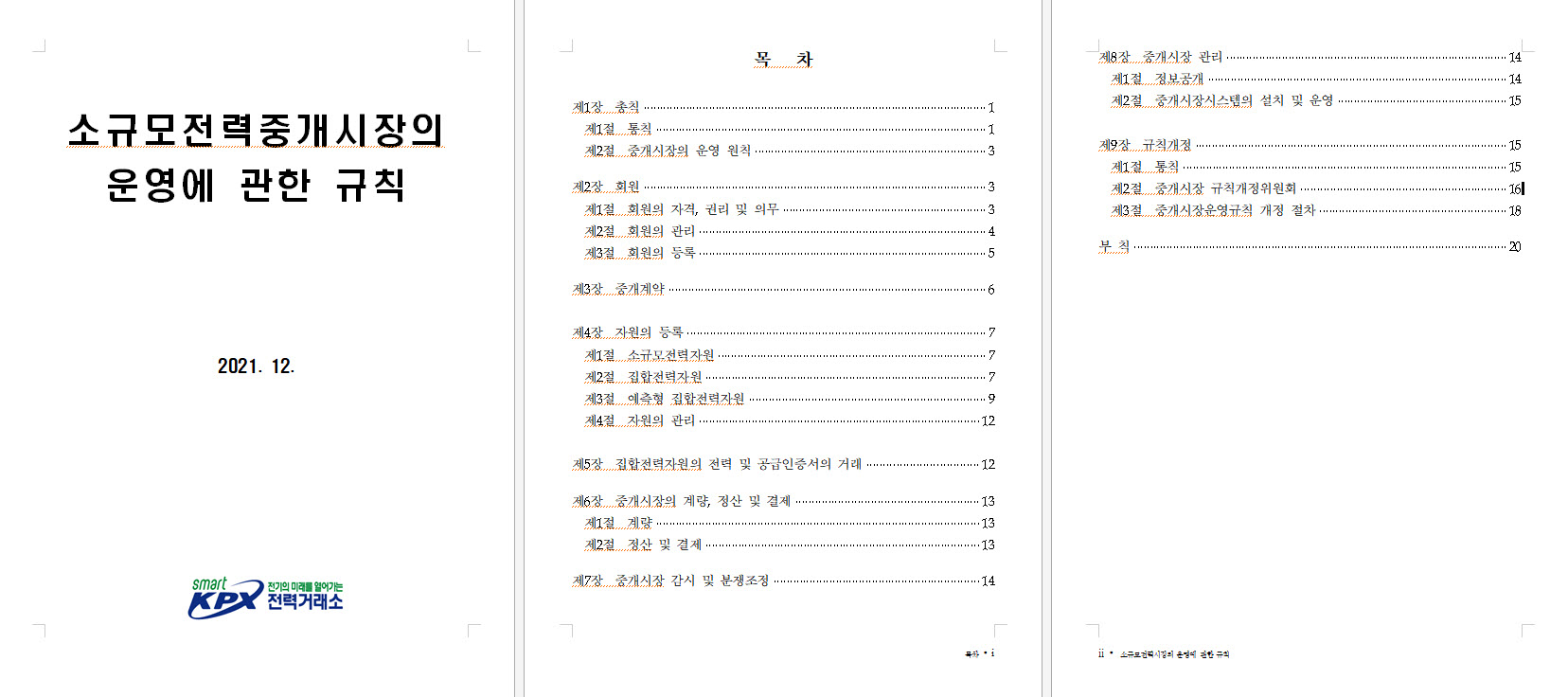 제1조(목적) 이 규칙은 전기사업법 제43조의2에 따라 한국전력거래소(이하 “전력거래소”라 한다)가 개설하는 소규모전력중개시장 운영에 필요한 사항을 정함을 목적으로 한다.