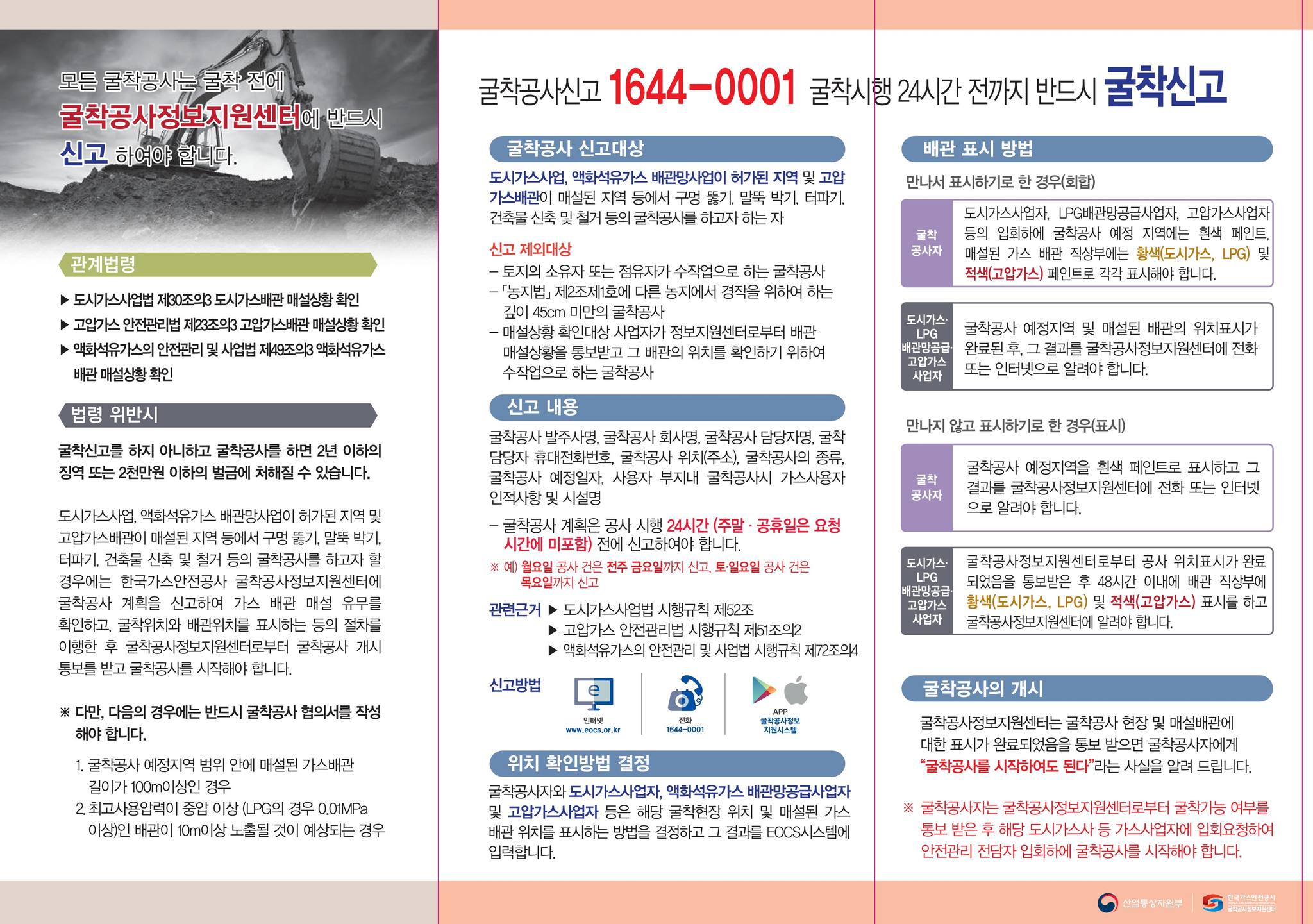 도시가스사업, 액화석유가스 배관망사업이 허가된 지역 및 고압가스배관이 매설된 지역 등에서 구멍 뚫기, 말뚝 박기, 터파기, 건축물 신축 및 철거 등의 굴착공사를 하고자 할 경우에는 한국가스안전공사 굴착공사정보지원센터에 굴착공사 계획을 신고하여 가스 배관 매설 유무를 확인하고, 굴착 위치와 배관 위치를 표시하는 등의 절차를 이행한 후 굴착공사정보지원센터로부터 굴착공사 개시 통보를 받고 굴착공사를 시작해야 합니다.