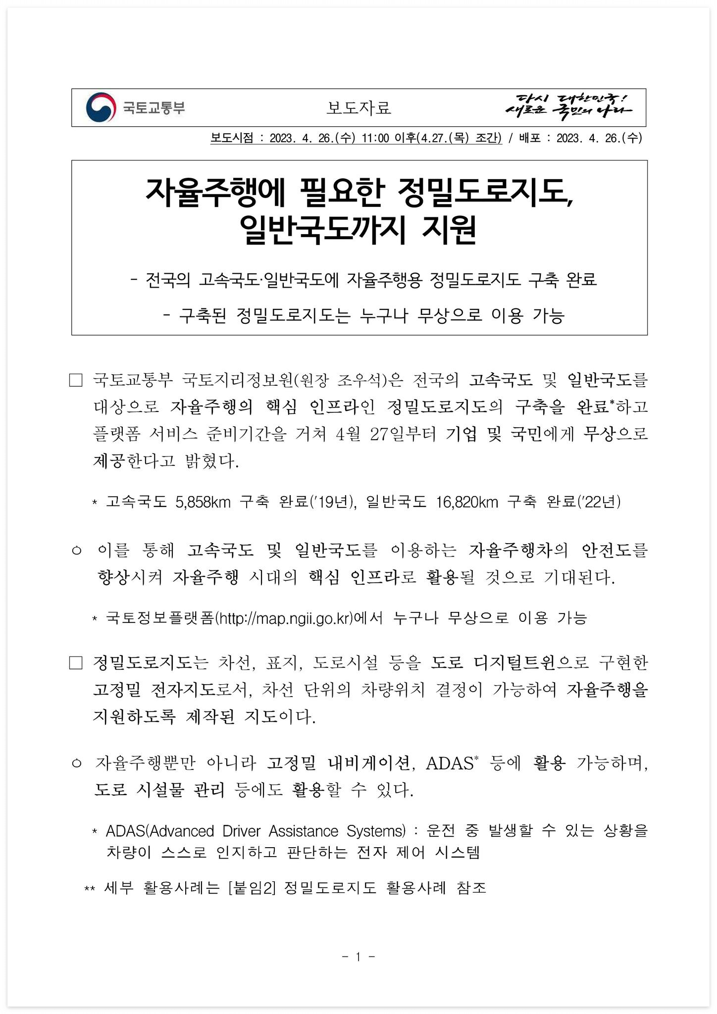 자료 다운로드 : 230427(조간)_자율주행에_필요한_정밀도로지도__일반국도까지_지원(스마트공간정보과)