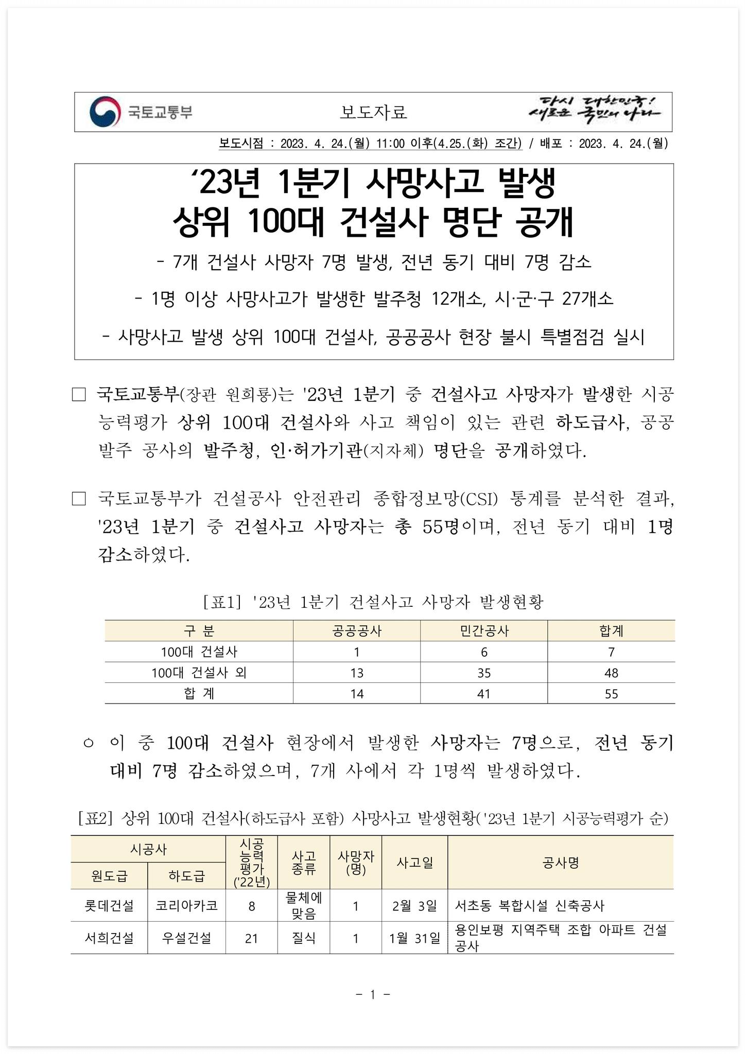 자료 다운로드 : 230425(조간)_1분기_사망사고_발생_상위_건설사_공개(건설안전과)