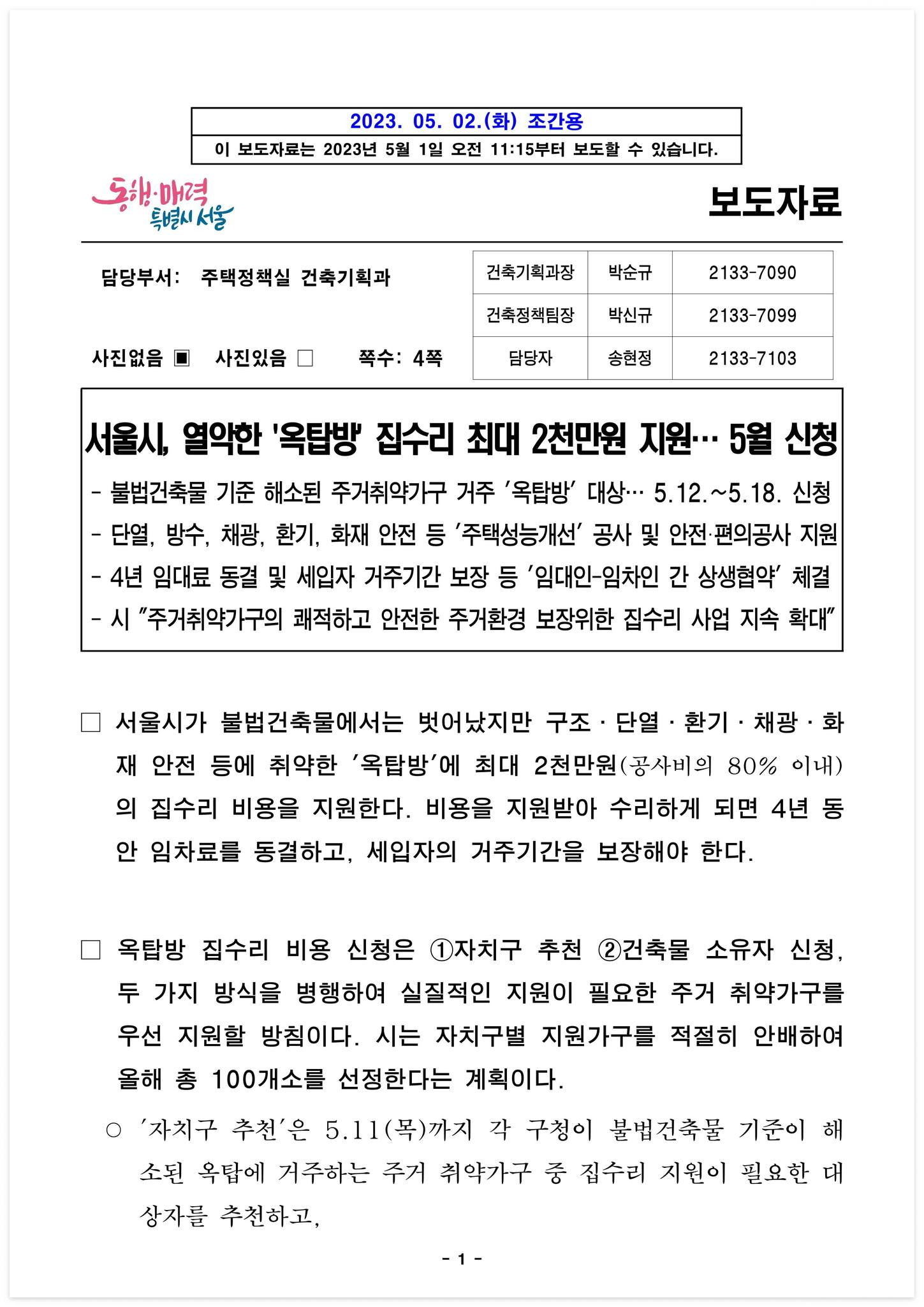 자료 다운로드 : 서울시, 열악한 옥탑방 집수리 최대 2천만원 지원… 5월 신청