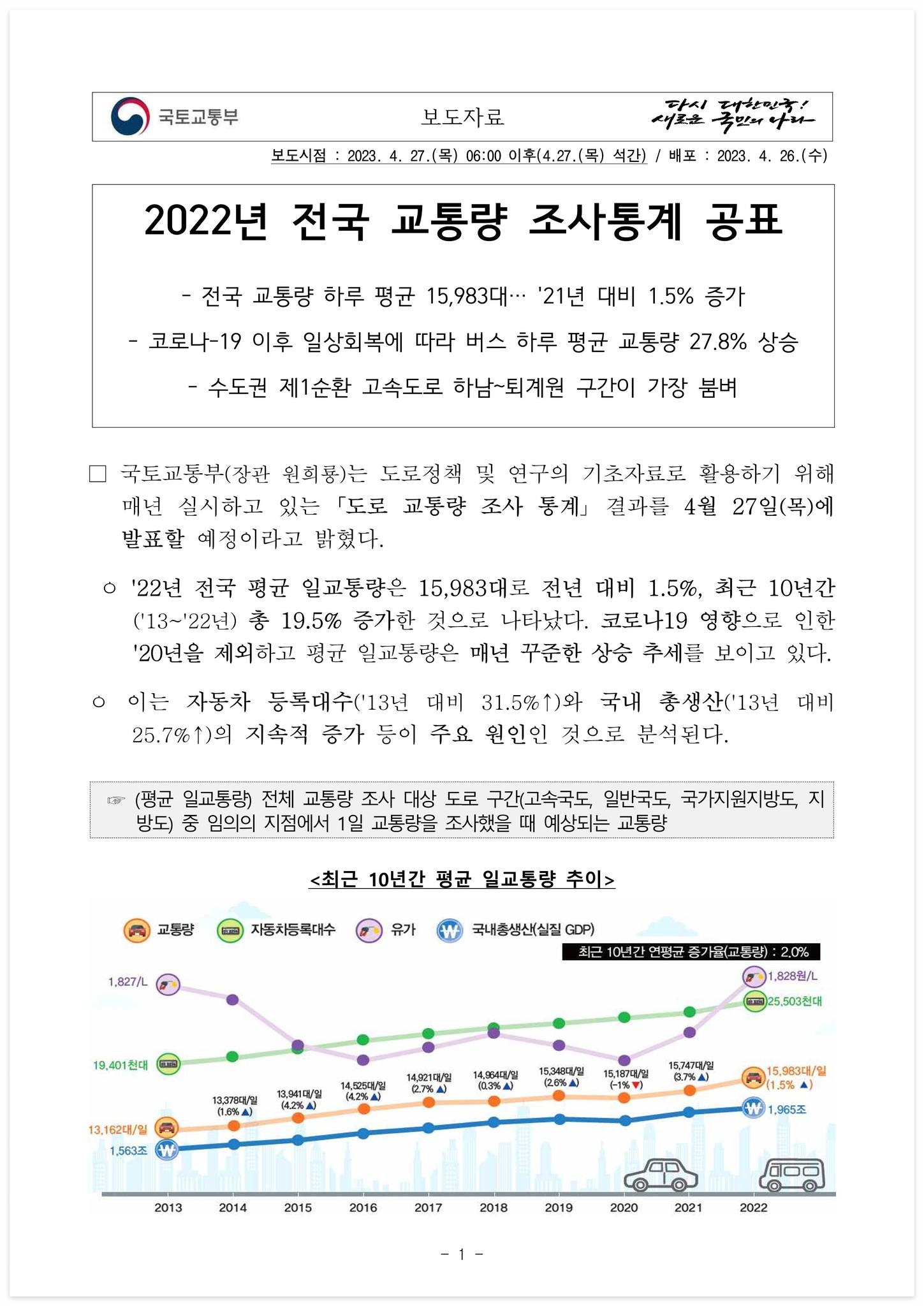 자료 다운로드 : 230427(석간)_2022년_전국_교통량_조사통계_공표(디지털도로팀)
