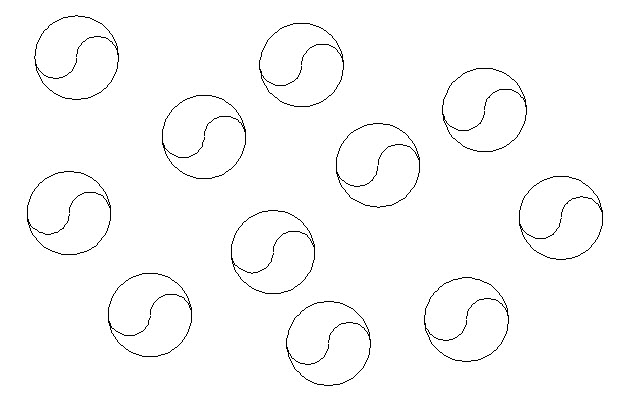 설명은 잠시 뒤로 미루고 이 루틴 전체를 복사해서 vlisp editor로 옮긴 후, 위에서 배운 것처럼 ctrl + alt + E로 load 해보자. 그리고 명령어인 tg를 command 창에 입력 후 마우스로 아무 곳이나 선택해 보자. 만약 error 없이 실행이 되었다면 “Program has been completed!!!” 라는 메시지와 함께 도면 상에 태극 무늬가 생성되었을 것이다. 반복해서 명령을 실행하여 아래와 같이 여러 개를 생성해 보자.