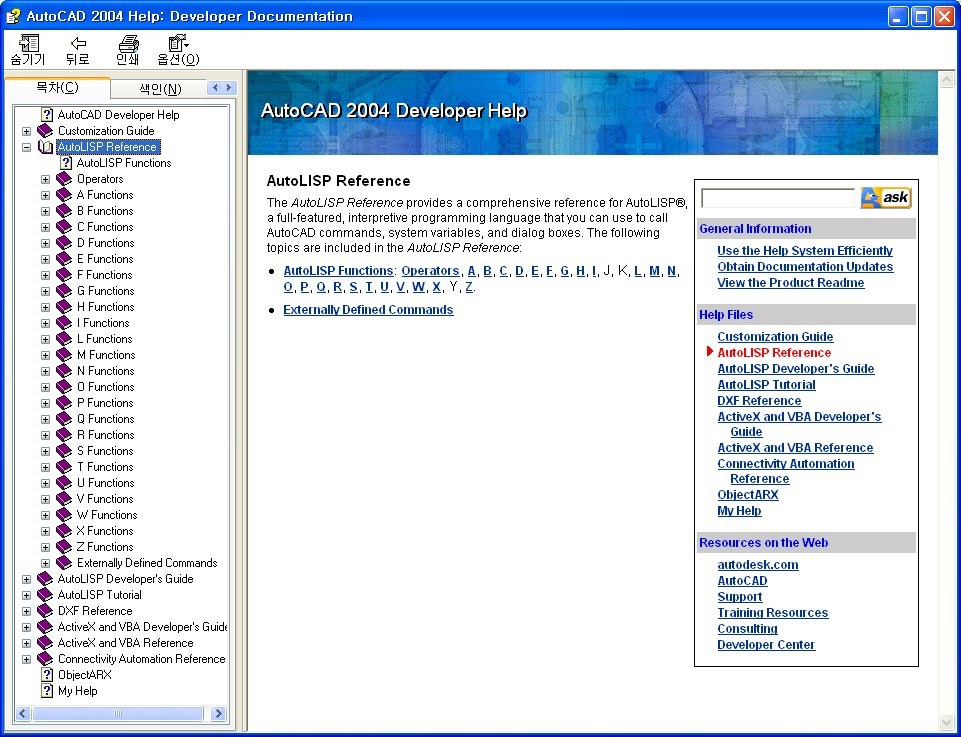 앞의 그림은 AutoCAD내의 도움말 화면이다. 첫 번째 강좌에서도 잠시 언급했지만 이 세상 어떤 책보다도 함수에 대한 설명이 자세하고 일목요연하게 알파벳 순으로 잘 정리되어 있다. 앞으로 저 화면을 수백 번, 수천 번을 봐야 한다. 다음에 소개할 함수들은 사용 빈도가 매우 높은 것들만을 소개하겠다.