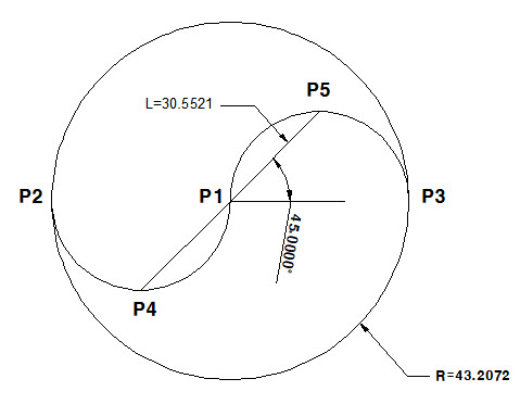 일단 모양을 만든 후 위와 같이 point들의 위치를 지정하고, 원의 지름을 적어둔다. 그리고 아직 끝난 것이 아니다. P4와 P5의 위치를 지정하려면 거리와 각도가 필요하다.