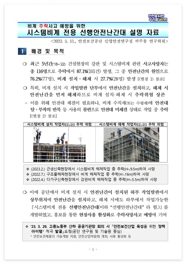 □ 자료 다운로드 : (붙임) 시스템비계 전용 선행안전난간대 설명자료