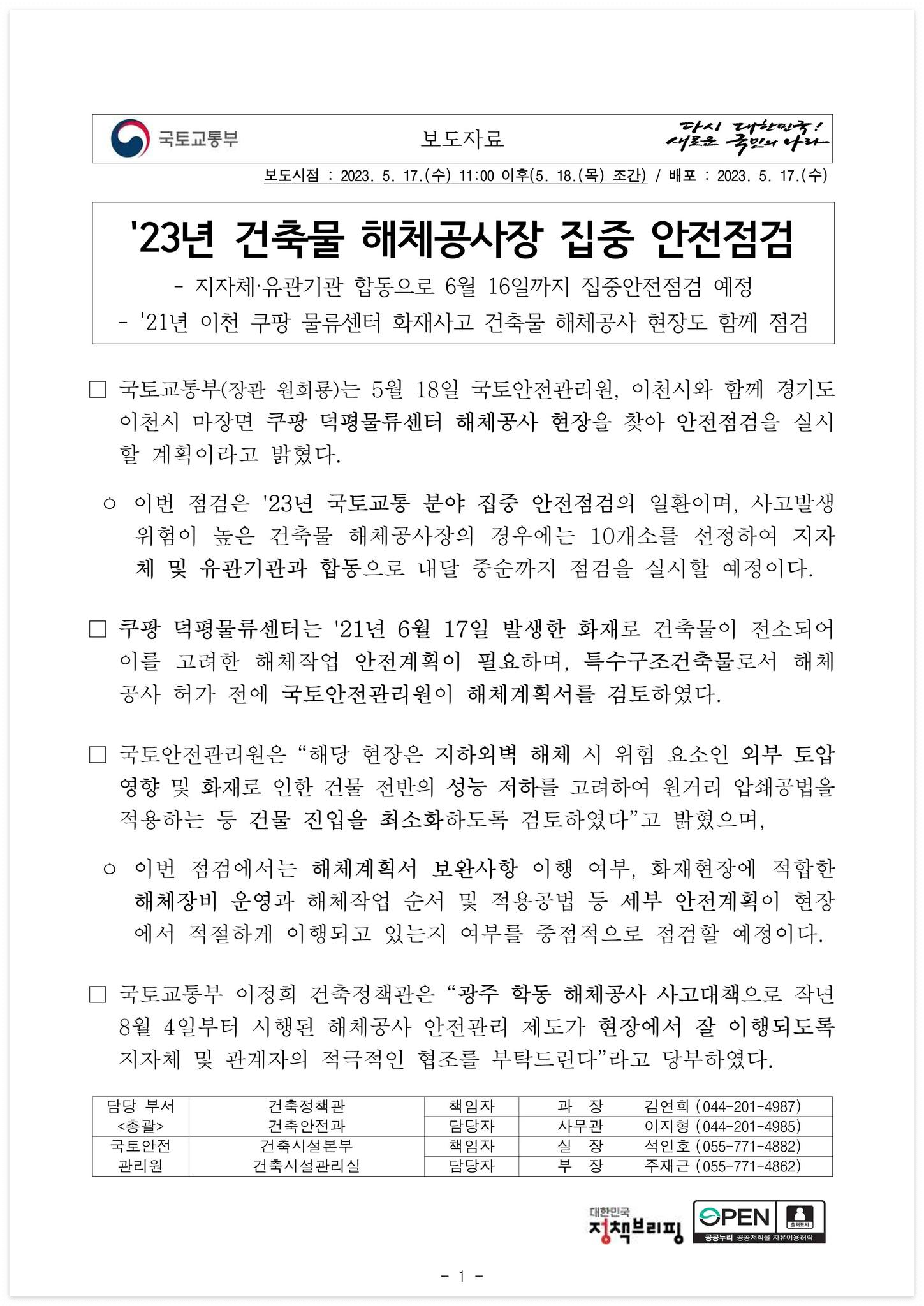 □ 자료 다운로드 : 230518(조간)_23년_건축물_해체공사장_집중_안전점검(건축안전과)