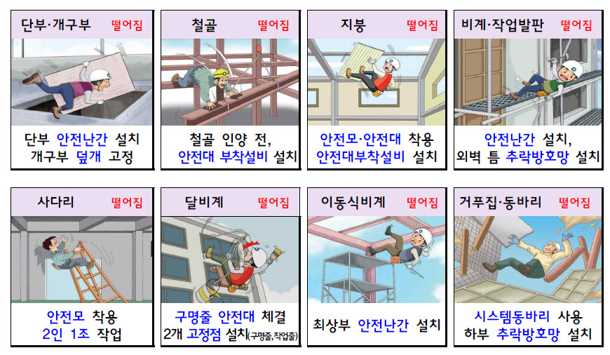 건설현장에서 대부분의 사망사고는 건축·구조물에 의해 발생하며, 단부‧개구부, 철골, 지붕, 비계·작업발판, 사다리, 달비계, 이동식비계, 달비계, 거푸집·동바리 등 현장에서 쉽게 접할 수 있는 구조물입니다.