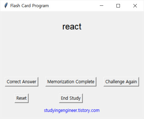 6. 대화창의 구성은 영어 단어를 보여주는 화면, 정답을 출력하는 화면, 정답 버튼, ‘암기 완료’ 버튼, ‘다시 도전’ 버튼, ‘초기화’ 버튼, ‘공부 종료’ 버튼으로 구성된다. ‘초기화’ 버튼을 누르면 모든 단어들이 [new] 그룹으로 이동되고 [practice]와 [complete] 그룹은 비어있게 된다. 그러면서 동시에 [new] 그룹의 단어 중 하나를 랜덤으로 추출해서 출력한다.