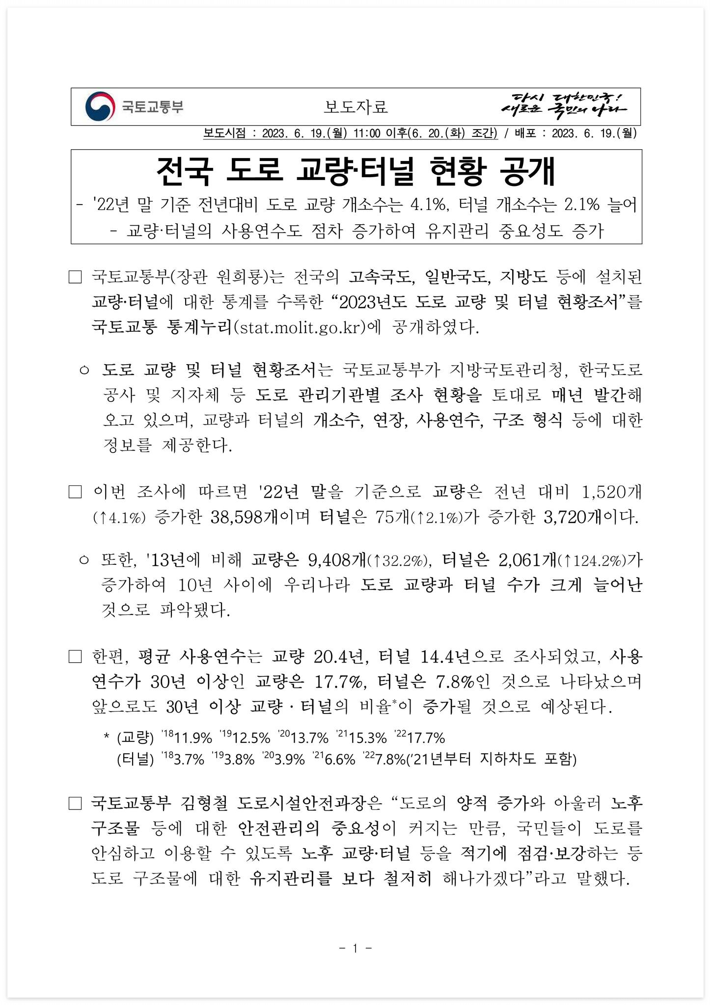 □ 자료 다운로드 : 230620(조간) 전국 도로 교량·터널 현황 공개(도로시설안전과)