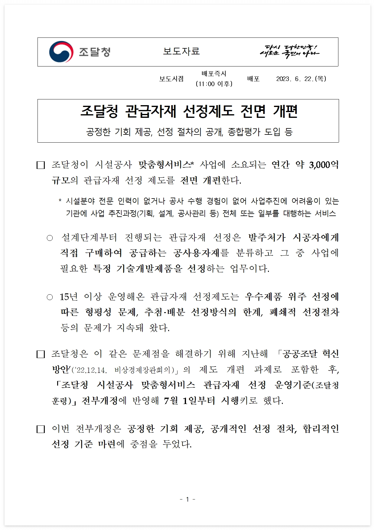□ 자료 다운로드 : 230622_(보도자료)_관급자재 선정 전면 개편_배포용