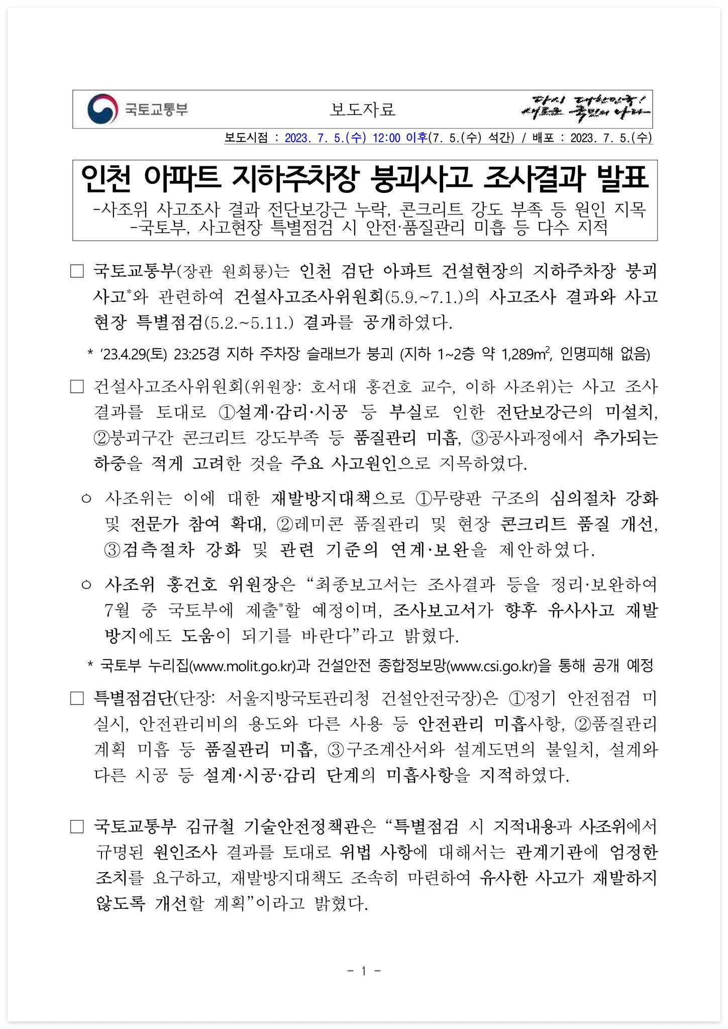 □ 자료 다운로드 : 230705(석간)_인천_아파트_지하주차장_붕괴사고_조사결과(건설안전과)