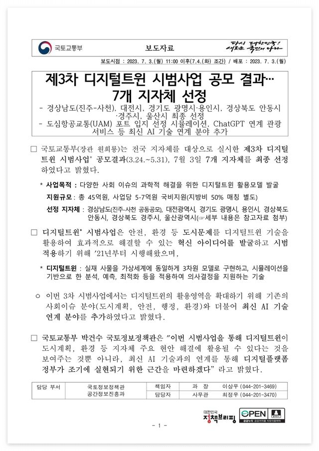 □ 자료 다운로드 : 230704(조간)_제3차_디지털트윈_시범사업_공모_결과(공간정보진흥과)