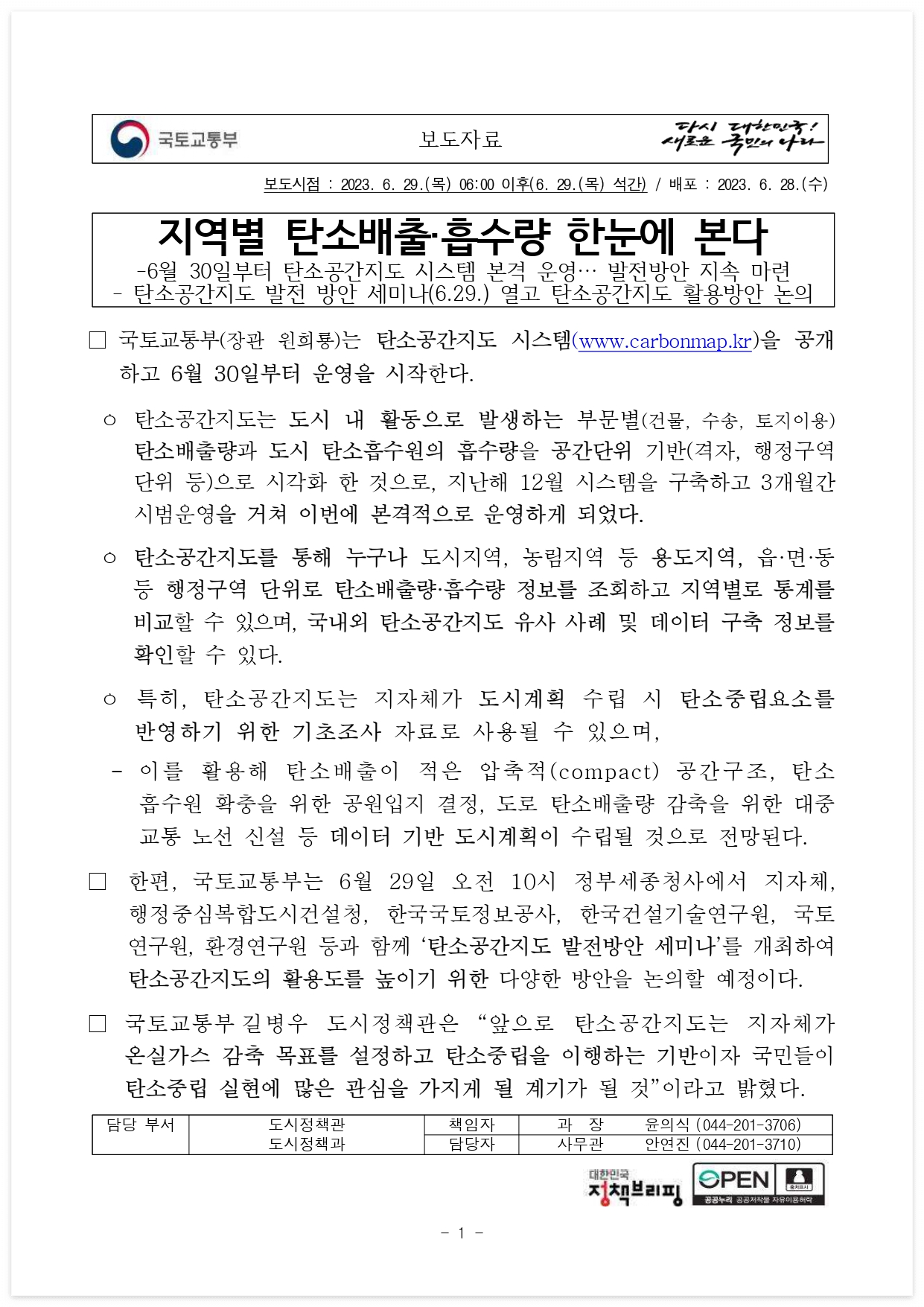 □국토교통부(장관 원희룡)는 탄소공간지도 시스템(www.carbonmap.kr)을 공개하고 6월 30일부터 운영을 시작한다.