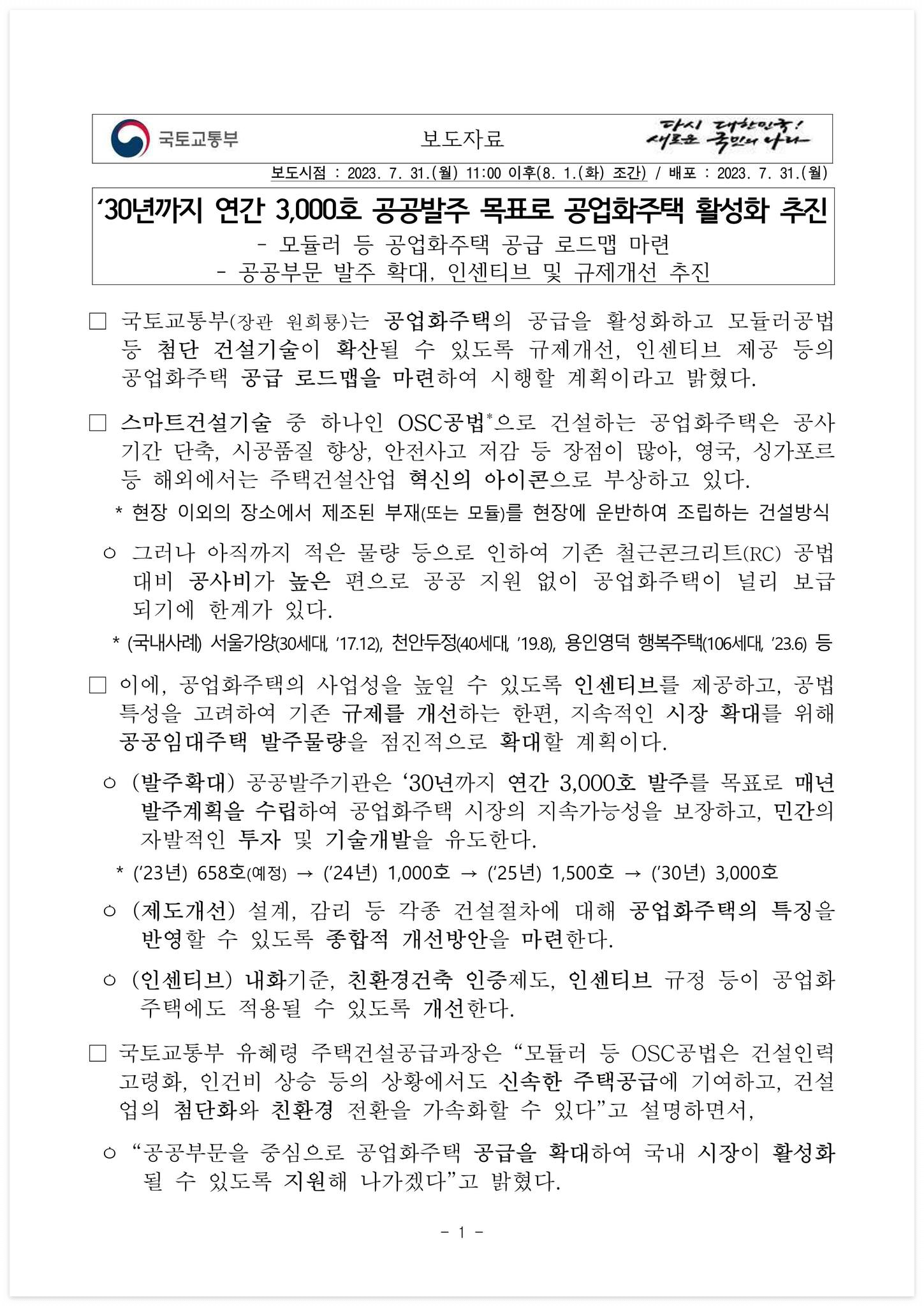 - 모듈러 등 공업화주택 공급 로드맵 마련