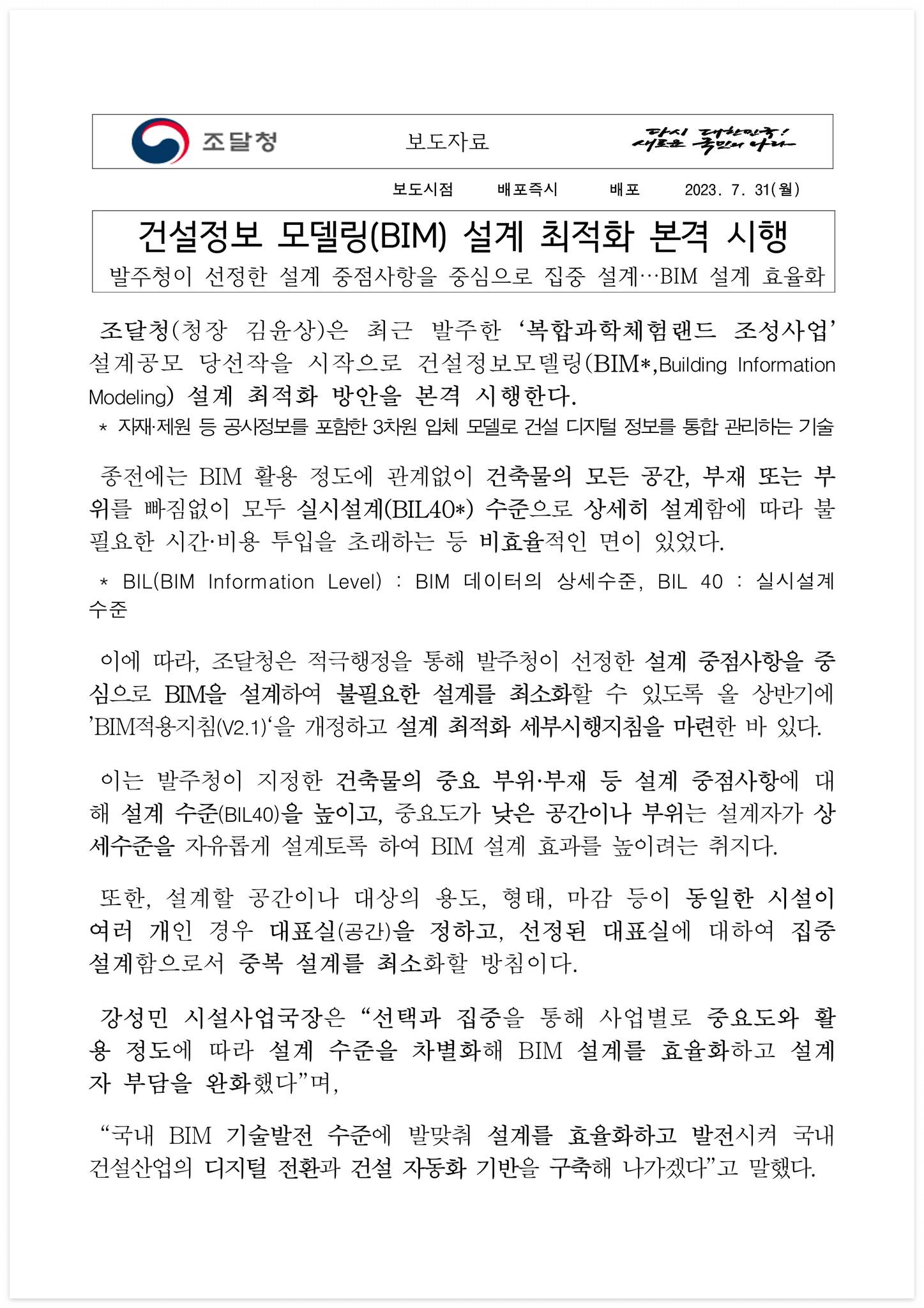 □ 자료 다운로드 : 230731_(보도자료)_건설정모델링(BIM) 설계 최적화 본격 시행