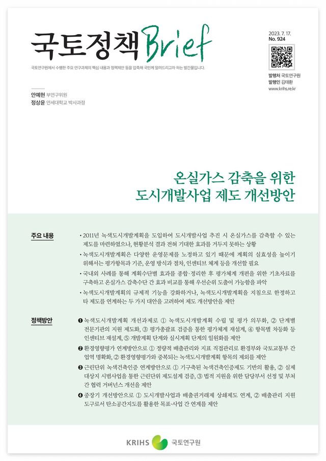 □ 국토연구원(원장직무대행 김태환) 안예현 부연구위원은 국토정책Brief 제924호 “온실가스 감축을 위한 도시개발사업 제도 개선방안”을 통해 국내 도시개발사업의 온실가스 배출현황을 분석하고, 관련 제도 간 중복성과 도시개발 온실가스 감축수단별 효과를 종합정리하여 현행 녹색도시개발계획의 문제점을 파악하고 제도 개선을 위한 과제를 도출하였다.