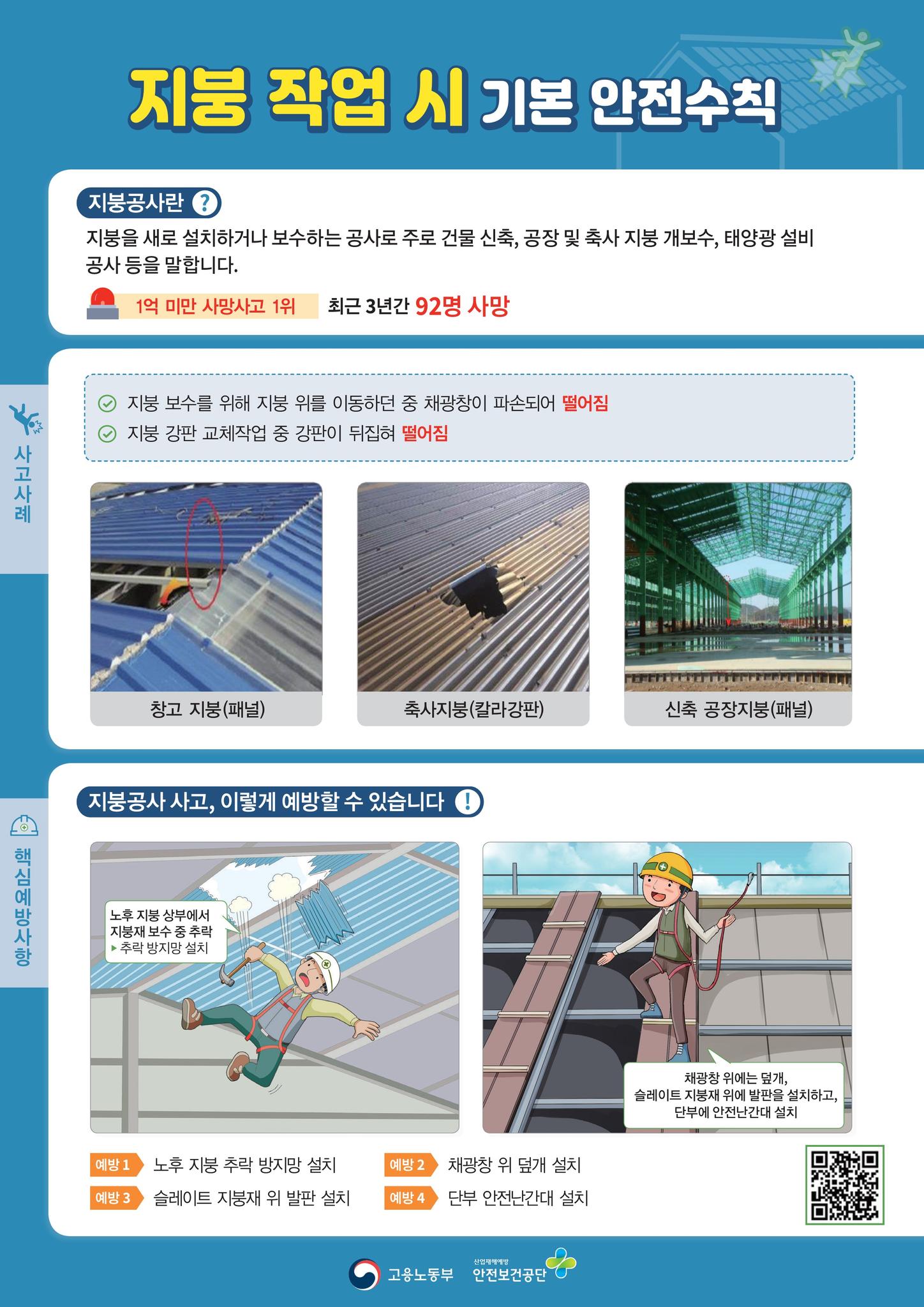 1. 지붕의 형태, 구조 등을 사전에 파악하여 적절한 이동통로, 작업발판설치 등 추락방지 조치를 한다.