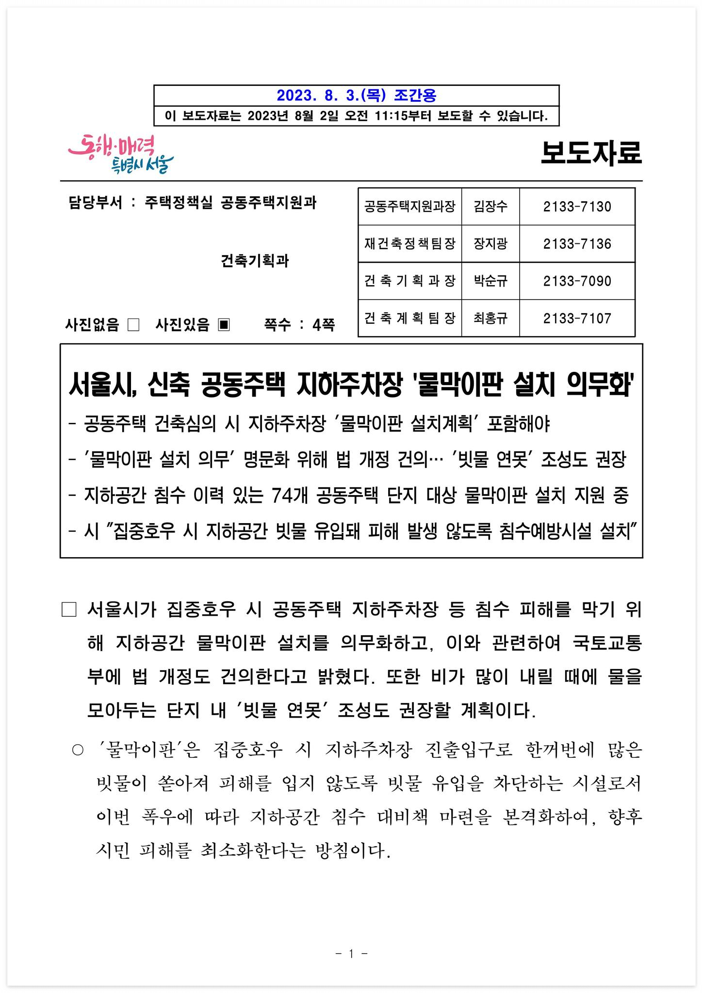 □ 자료 다운로드 : 서울시, 신축 공동주택 지하주차장 `물막이판 설치 의무화`