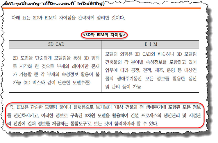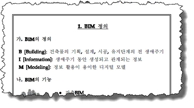 문서 내에는 훌륭한 자료들이 많이 포함되어 있는데 정작 맨 처음을 장식하는 정의 부분은 엉망이다. B를 건축물의 전 생애주기라고 한 것은 번역 및 편집상의 실수로 보이고, M을 Modeling이라고 해놓고 ‘디지털 모델’이라고 명확하게 정의를 해놓았다. 대단히 실망스러운 부분이다. 국회에서 각계 전문가들이 모여 정말 이 정도 수준으로 토론을 펼쳤는지 믿을 수가 없어서 자세히 살펴 보았다.
